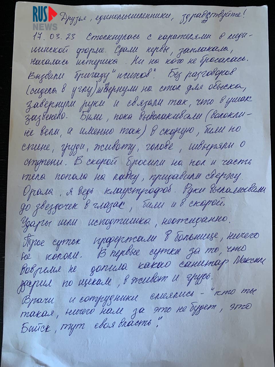 После этого силовики вызвали бригаду санитаров, которые сильно избили Пономаренко. «Били по спине, груди, животу, голове, швыряли о ступени», — рассказывает в письме журналистка. В самой больнице к ней также применяли силу: «В первые сутки за то, что вовремя не допила какао, санитар Максим ударил по щекам, в живот и грудь».