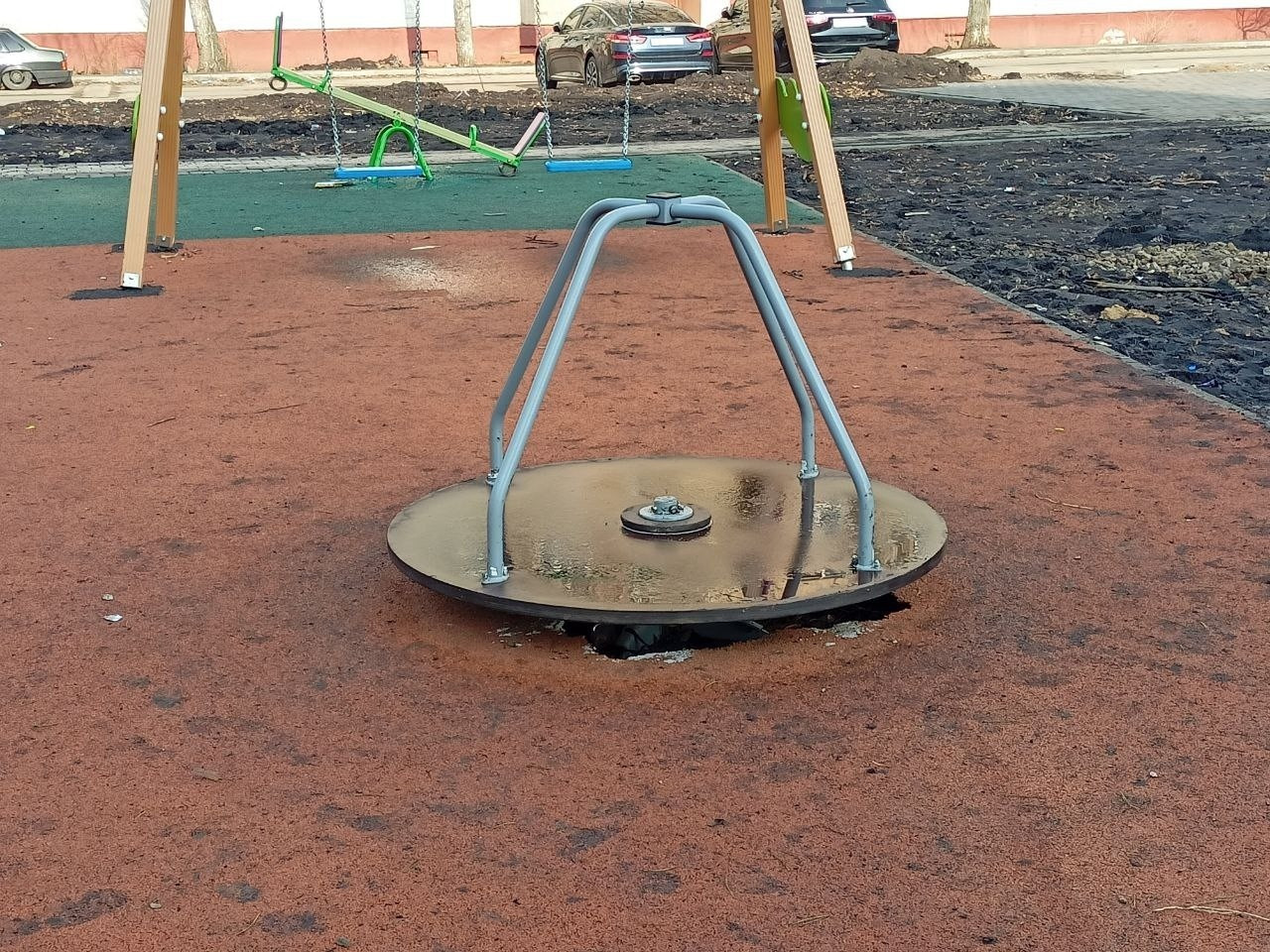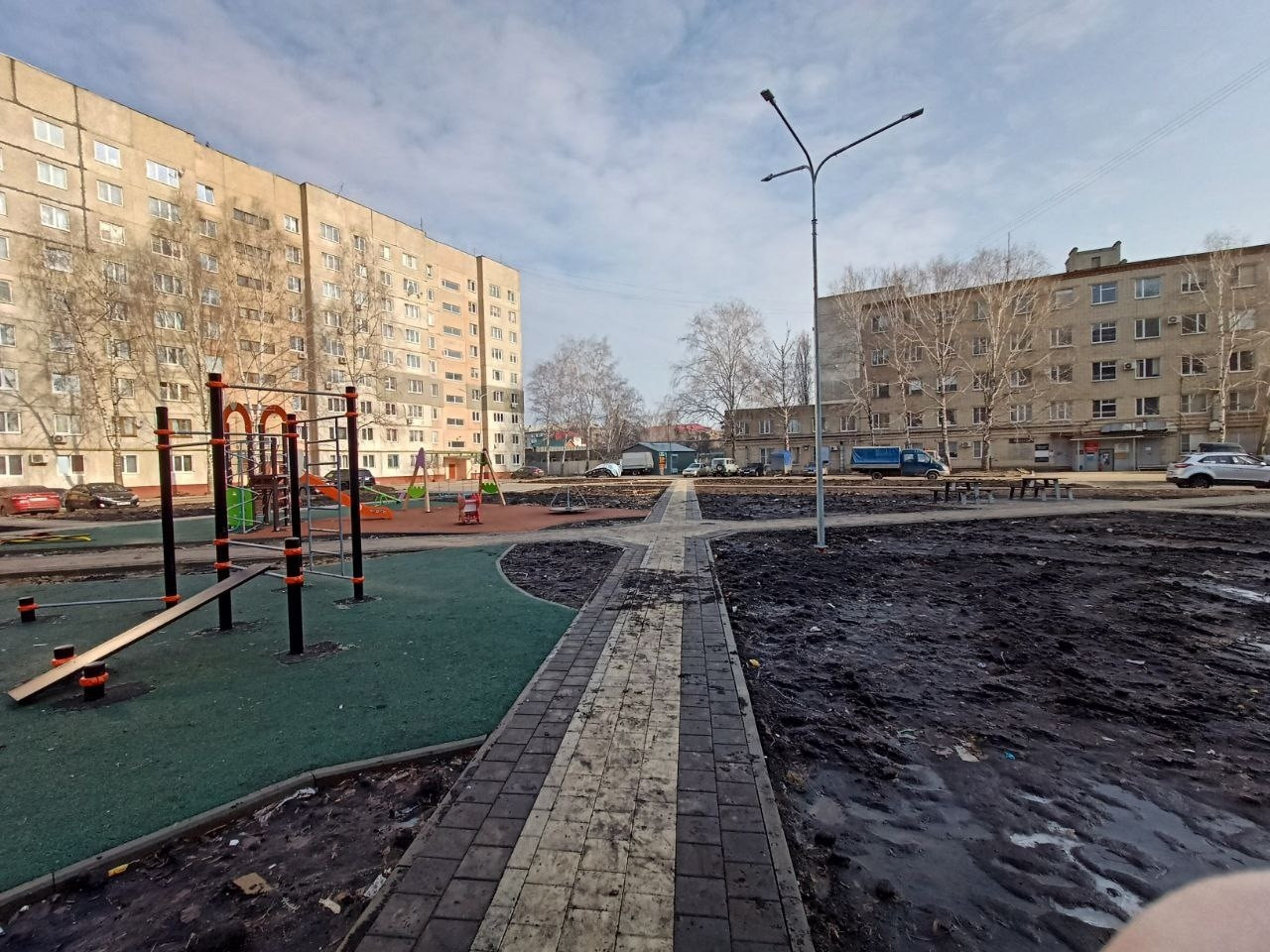 Сейчас вместо газонов раскиданный строительный мусор, наскоро и криво поставленные объекты детского комплекса, под которым видны дыры, создающие опасность для детей. Одиноко стоят два стола для игры в шахматы под открытым небом. Асфальтовое покрытие оказалось очень некачественным и быстро начало разрушаться.