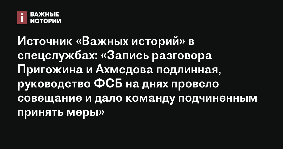 Источник «Важных историй» в спецслужбах: «Запись разговора Пригожина и Ахмедова подлинная, руководство ФСБ на днях провело совещание и дало команду подчиненным принять меры»