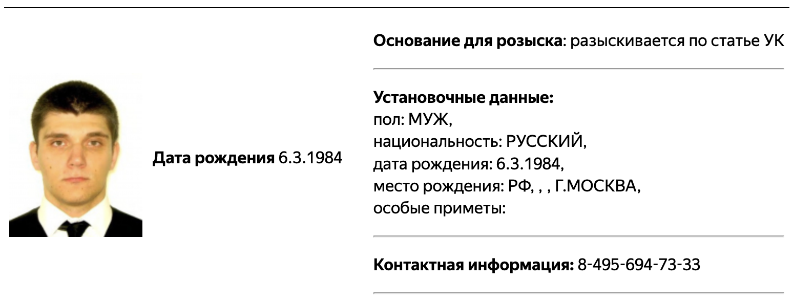 Согласно карточке из базы МВД, Капустина разыскивают по уголовной статье. Ранее против мужчины возбудили дело о теракте (статья 205 УК), участии в деятельности террористической организации (статья 205.4 УК) и незаконном обороте взрывчатых веществ (статья 222.1 УК).