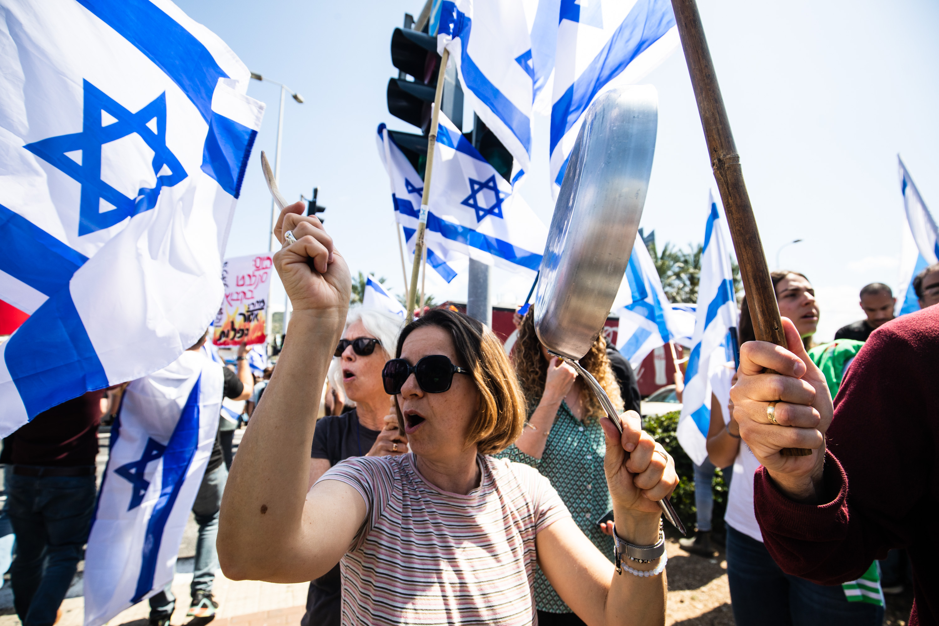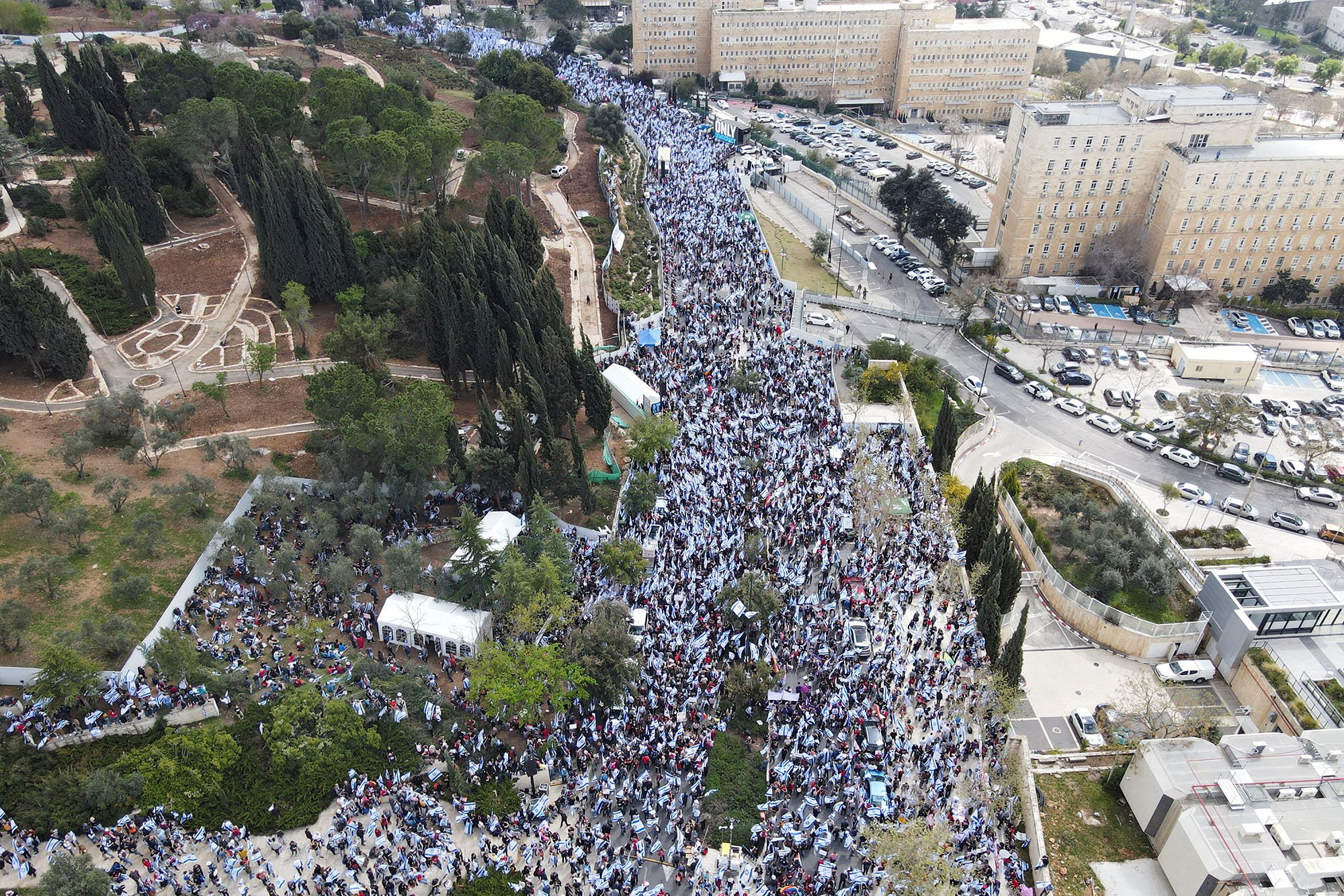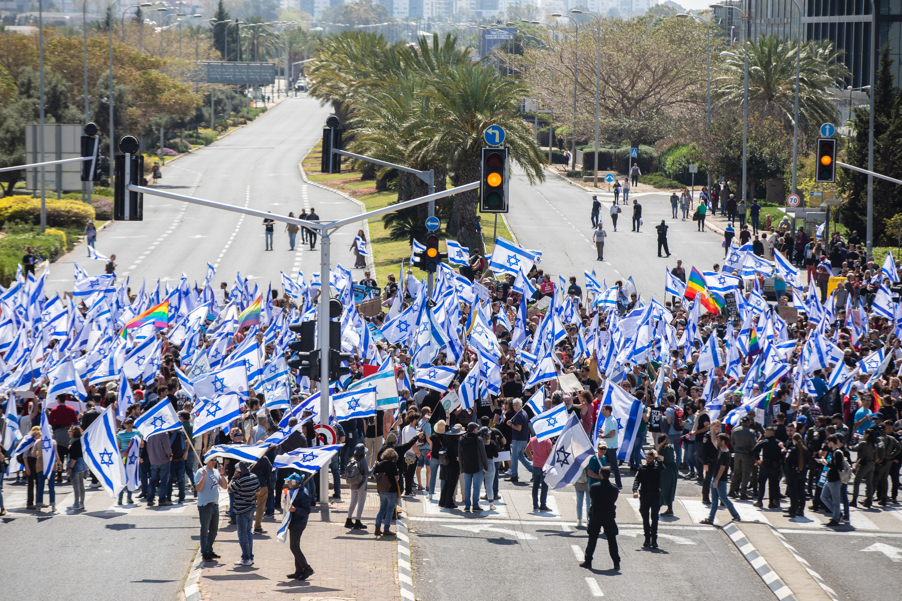 Сначала израильтяне митинговали по выходным, но потом стали выходить на улицы и в будни. Одна из самых масштабных антиправительственных акций в середине марта собрала около полумиллиона протестующих по всей стране.