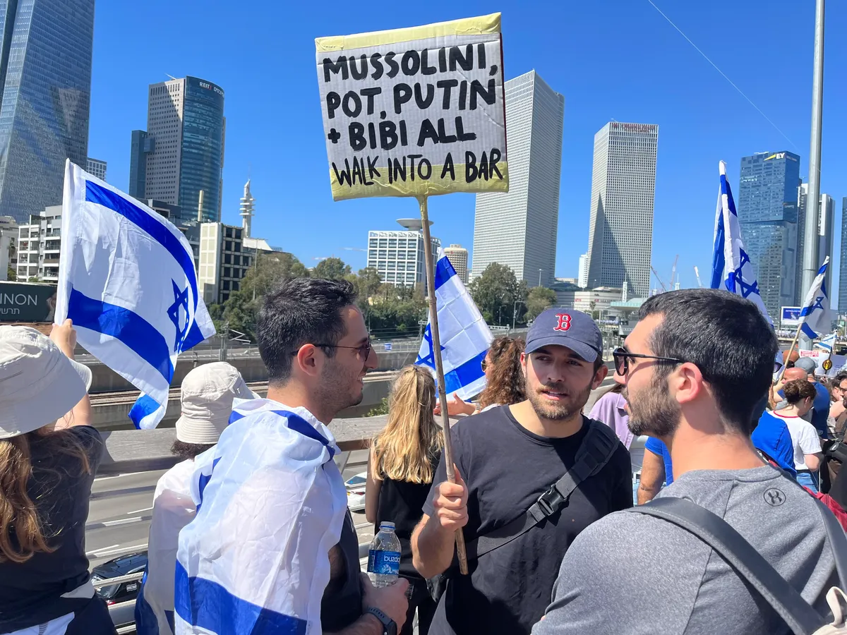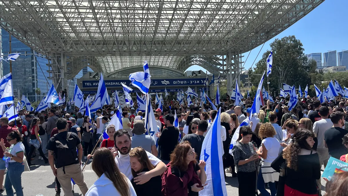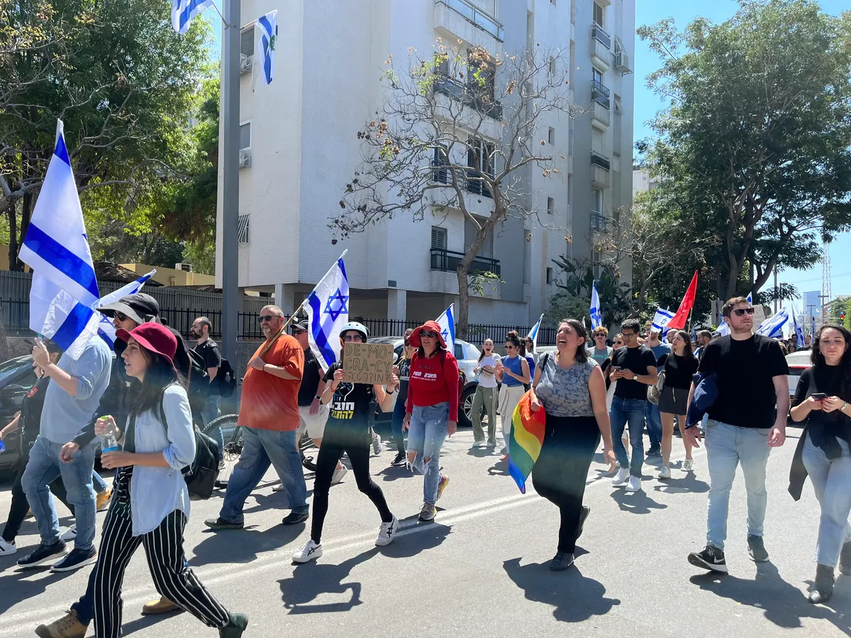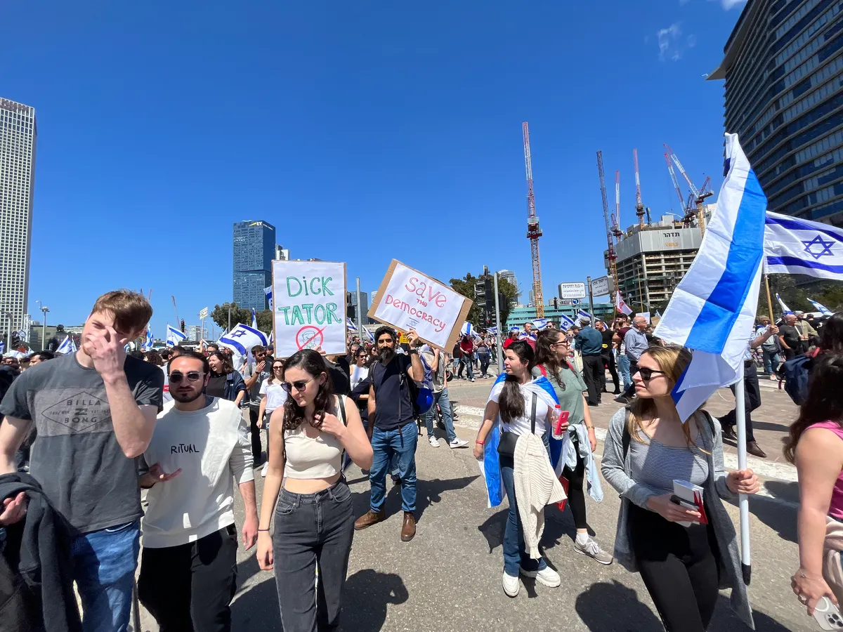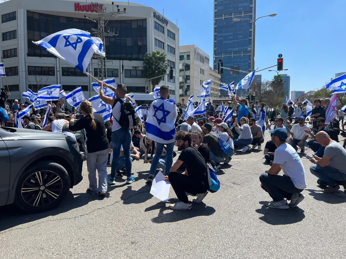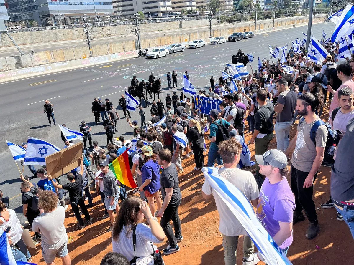 В одном из самых популярных для проведения протестов месте — на пересечении улиц Каплан и Менахем Бегин с утра собралась внушительная толпа протестующих. Несмотря на всю серьезность ситуации, на протесте в Тель-Авиве сложно отделаться от ощущения, что ты находишься на каком-то фестивале. Тысячи людей не вышли сегодня на работу, студенты не пошли на учебу. Улицы были заполнены израильскими флагами, со всех сторон доносился свист, люди пели и танцевали под крики «Де-мо-кра-тия».