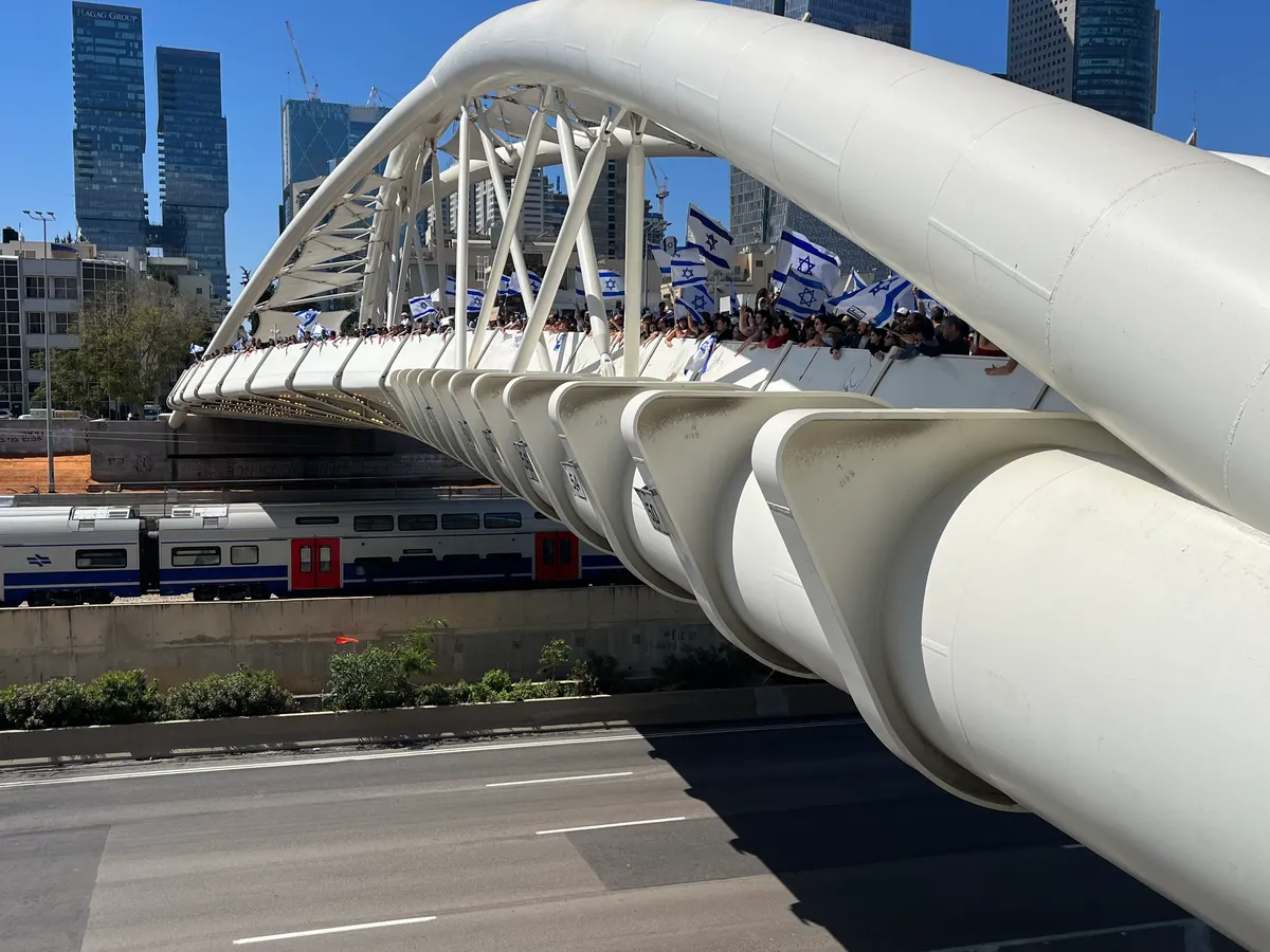 Большое количество протестующих собралось на мосту Ицхак Навон над шоссе, поэтому, проходя по нему, становилось немного не по себе: «А вдруг конструкция не выдержит веса демократии?»