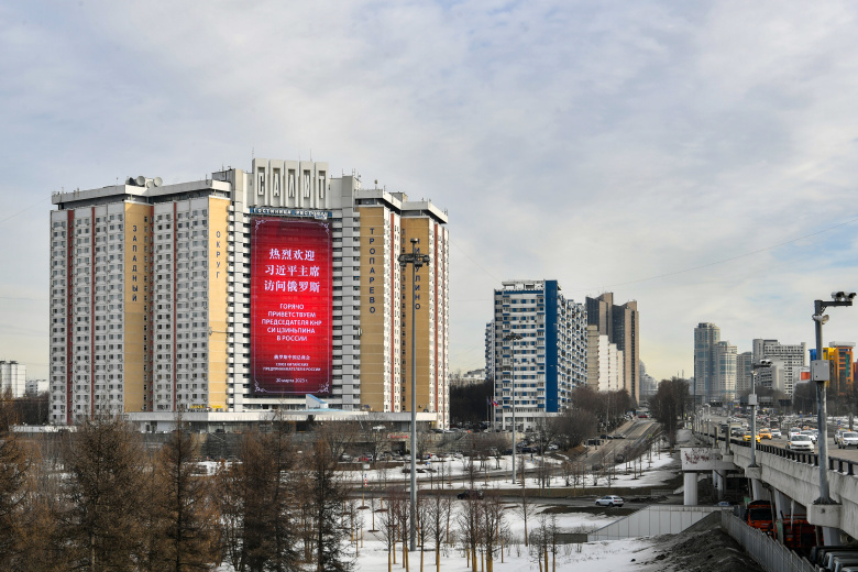 Приветствие в адрес председателя КНР Си Цзиньпина на фасаде жилого дома в Москве, 20 марта 2023 года