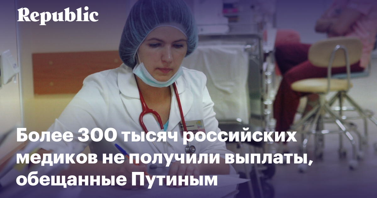 Медики по всей России не получают обещанных Владимиром Путиным социальных выплат, которые должны были охватить свыше миллиона сотрудников первичного звена здравоохранения и системы скорой помощи. К настоящему моменту надбавок не увидели свыше 300 тысяч медицинских работников, признают в Минздраве РФ. У чиновников, профсоюзов и руководства больниц нет единого понимания, кто и какую надбавку к зарплате должен получать.