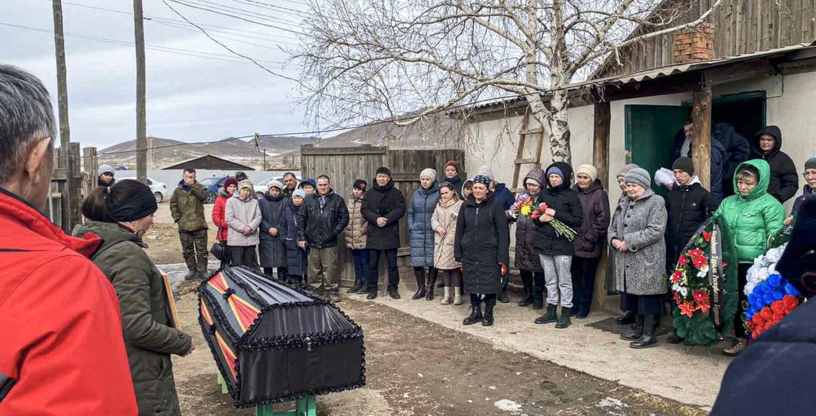 Утром восьмого марта сотрудники «Вагнера» привезли тело Алексея в Петропавловку. Гроб, обтянутый чёрной тканью, поставили во дворе у Окладниковой на два табурета. На прощание пришло около 50 человек — все жители Петропавловки. Несколько сельчан принесли цветы. С гробом привезли три венка — от ЧВК «Вагнер», от республиканского правительства и от Народного Хурала Бурятии. Елена купила ещё один венок — от себя.