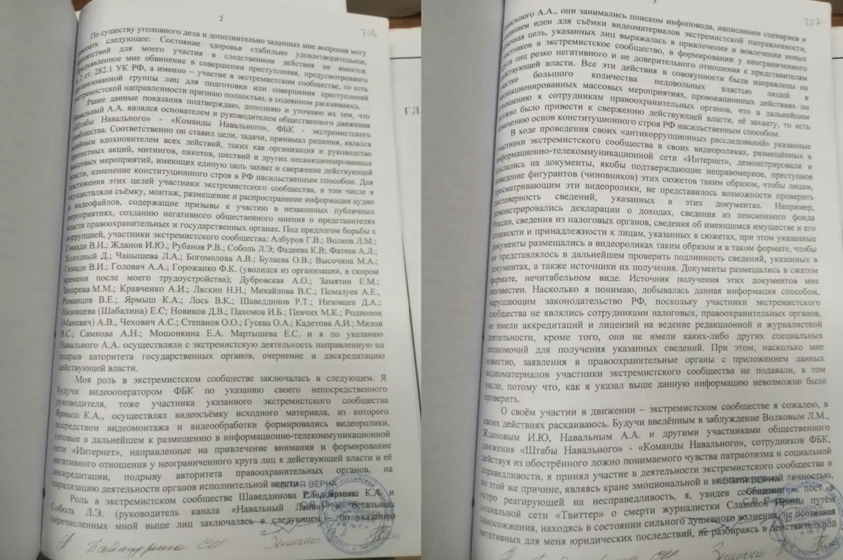 «Я, будучи видеооператором ФБК по указанию своего непосредственного руководителя, тоже участника указанного экстремистского сообщества Ярмыш К.А. осуществлял видеосъемку исходного материала, из которого формировались видеоролики, направленные на привлечение внимания и формирование негативного отношения у неограниченного круга лиц к действующей власти и ее дискредитации», — приводит Жданов показания Зеленского.