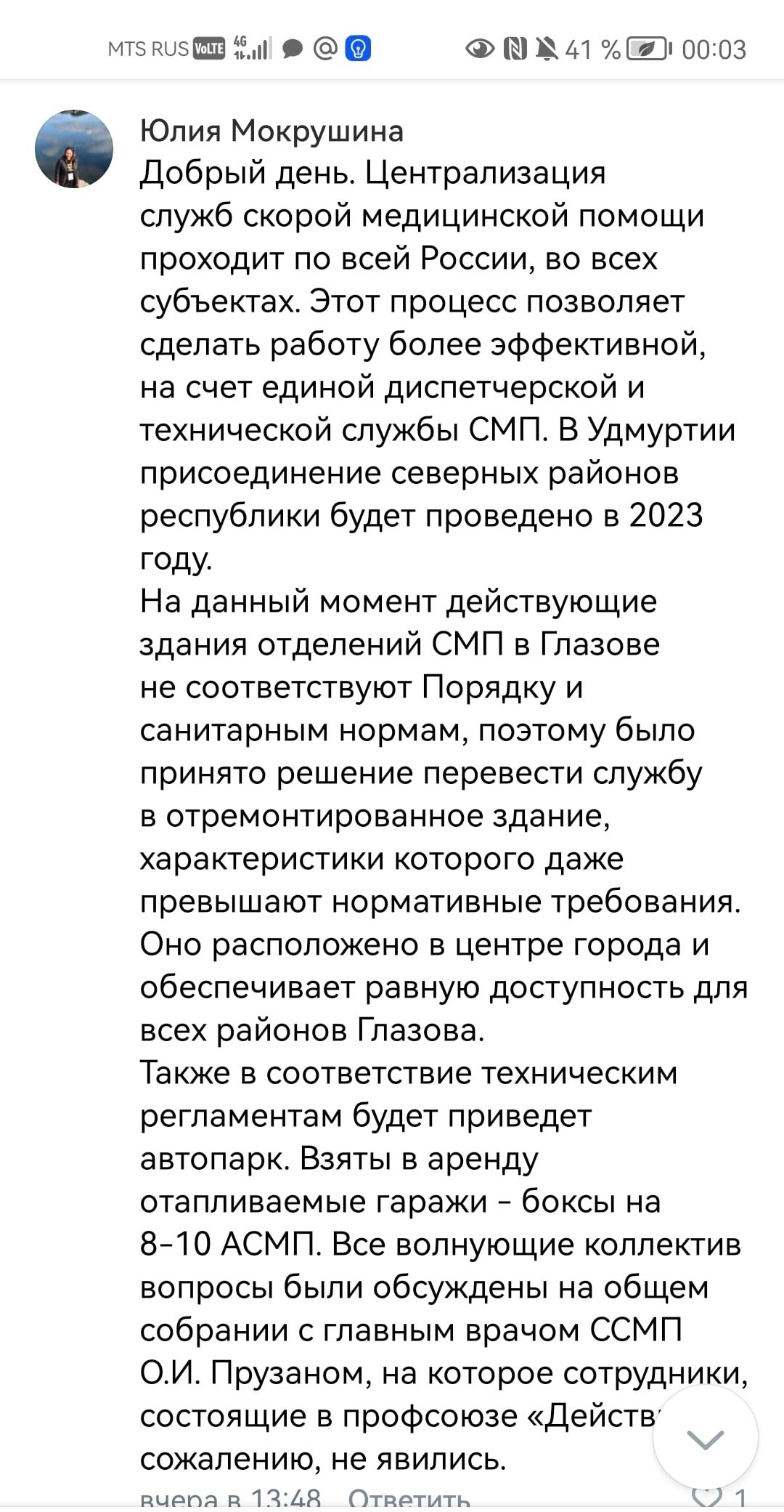 Теперь что касается равной доступности. К сожалению, официальный представитель Минздрава Удмуртии Юлия Мокрушина плохо владеет реальной ситуацией в Глазове и не знает, что, к примеру, подстанция на Буденного, которая подлежит закрытию как "не соответствующая" мифическим "порядкам" и "санитарным нормам", принимает пациентов и оказывает необходимую медицинскую помощь в круглосуточном режиме самого многонаселенного микрорайона Глазова - Левобережье, где несколько лет назад был закрыт филиал поликлиники.