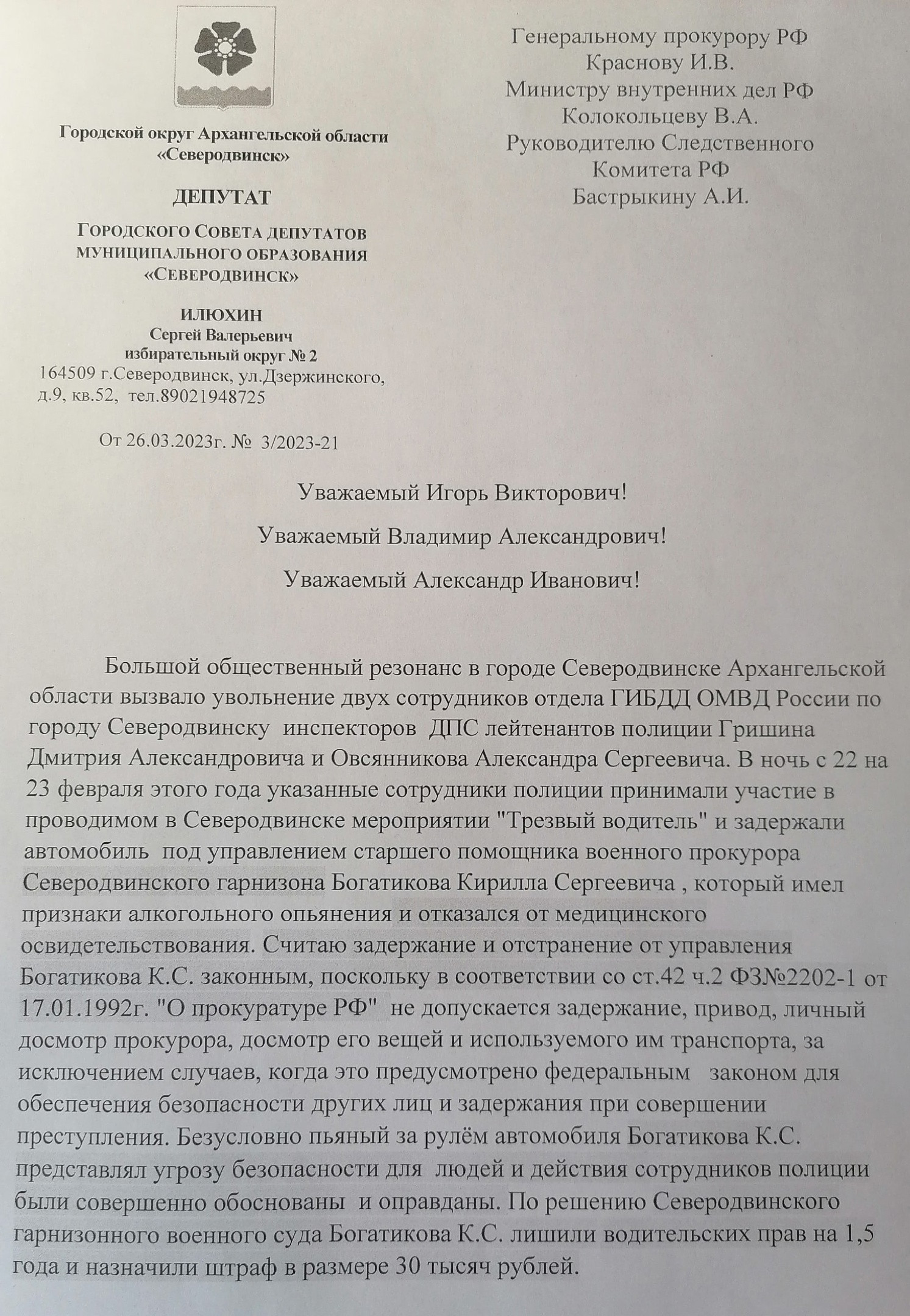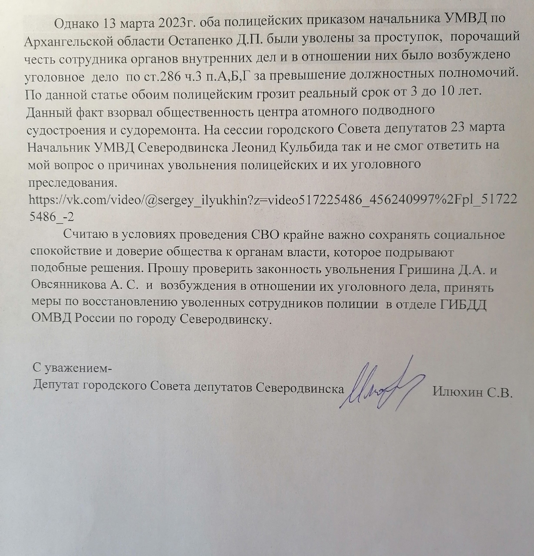 Данный факт взорвал общественность. На сессии городского совета депутатов 23 марта Начальник УМВД Северодвинска Леонид Кульбида так и не смог ответить на мой вопрос о причинах увольнения полицейских и их уголовного преследования. Вчера направил обращение в Генеральную прокуратуру РФ, министру внутренних дел и руководителю Следственного комитета с требованием проверить законность увольнения офицеров и возбуждения в отношении них уголовного дела, принять меры по восстановлению уволенных сотрудников полиции в отделе ГИБДД ОМВД России по городу Северодвинску.