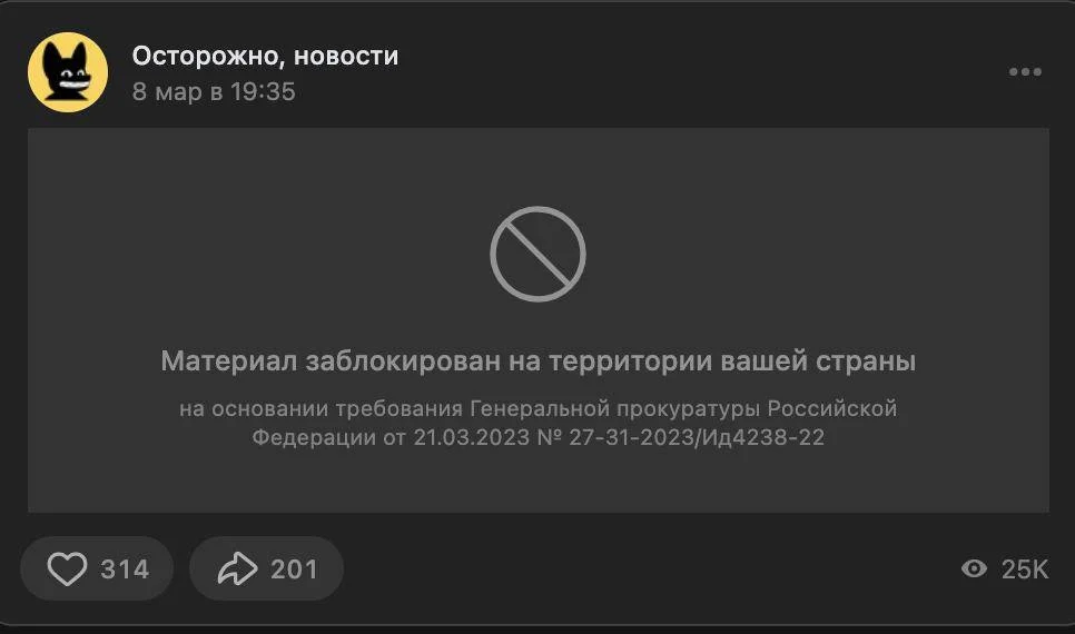 Генпрокуратура РФ 21 марта вынесла решение о блокировке одного из постов «Осторожно, новости» в VK. Об этом сообщило само издание.