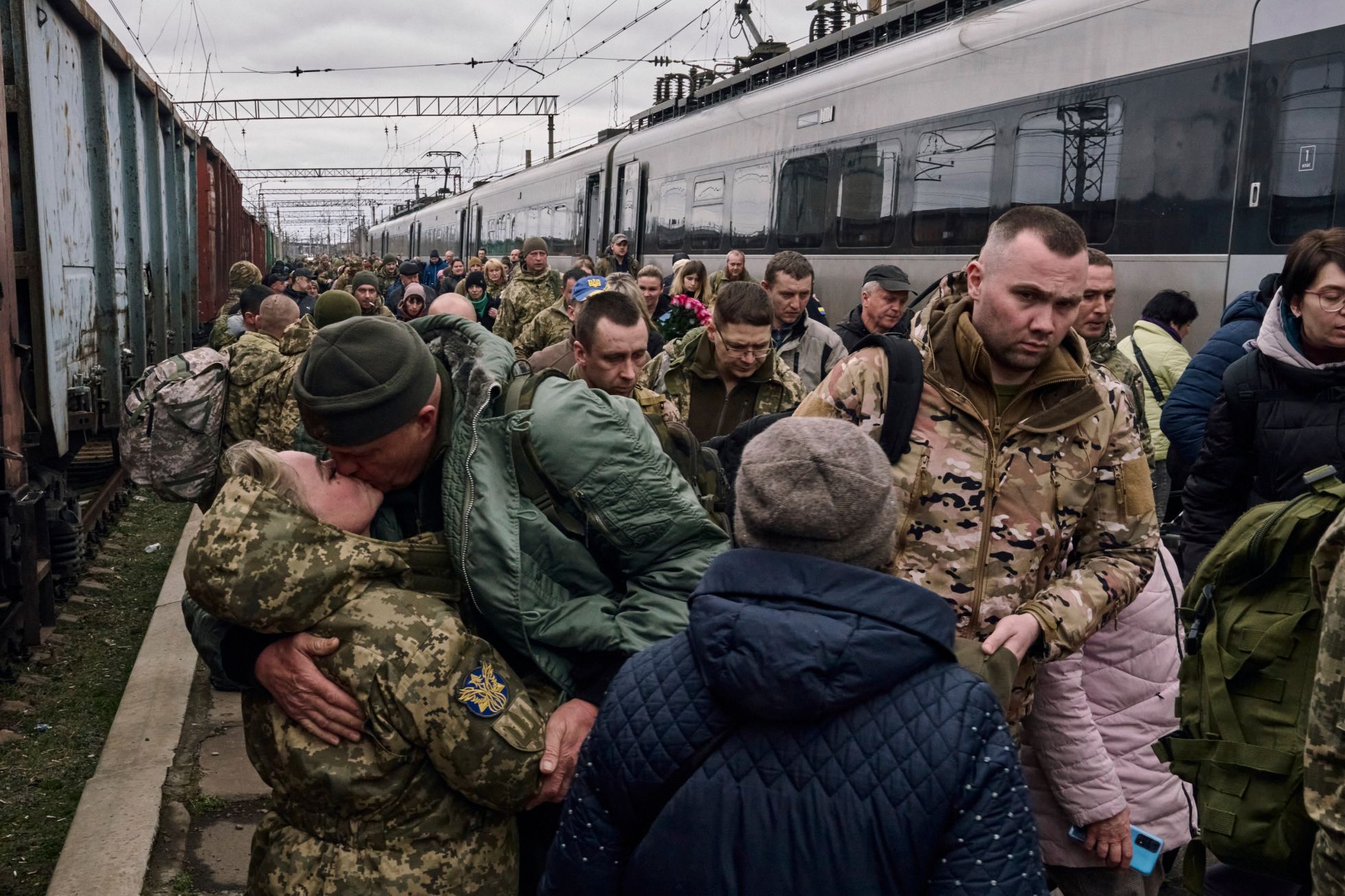 Бойцы ВСУ и их близкие на вокзале Краматорска