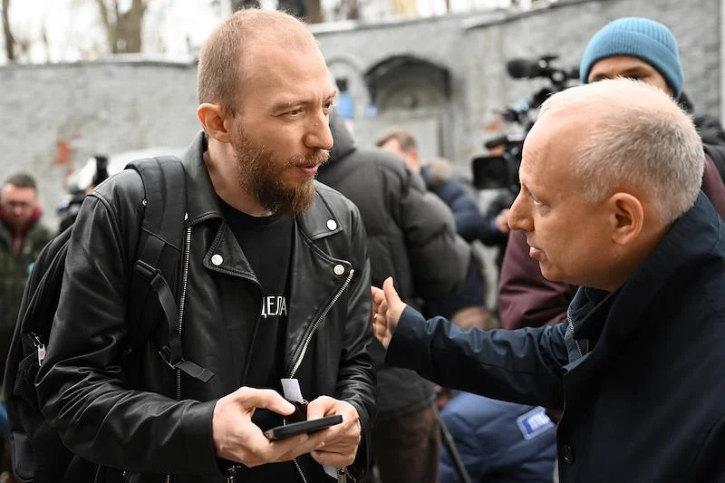 Журналист Wall Street Journal Эван Гершкович (в желтой куртке) после заседания суда. Фото: Дмитрий Лебедев / Коммерсантъ