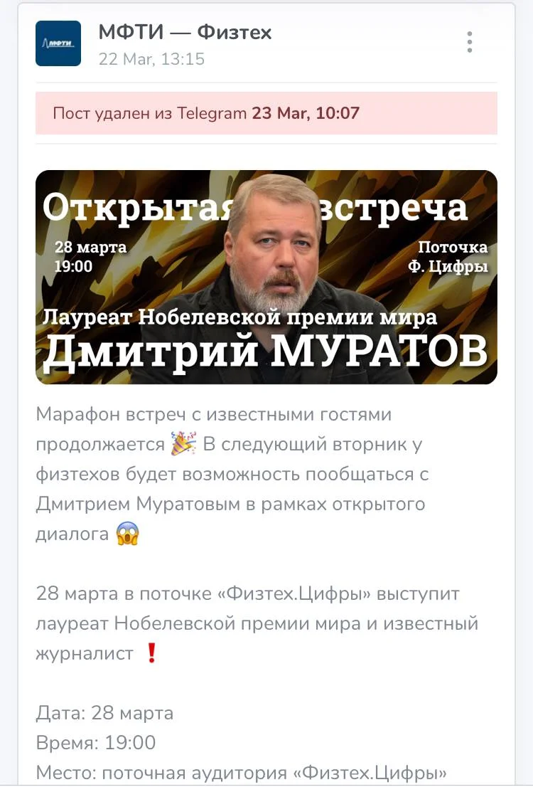 22 марта днем на сайте МФТИ появился анонс встречи главного редактора «Новой газеты» Дмитрия Муратова со студентами Физтеха. Она должна была состояться 28 числа, а планировалась еще с зимы. Через несколько часов сотни телеграм-каналов, не имеющих отношения ни к студенчеству, ни к физике, выдали однотипные посты с требованиями отправить ректора в отставку, Муратова арестовать, а студентов научить помнить сталинскую доброту (дескать, тот милостиво дозволил вузу быть, несмотря на доносы на вольнодумных ученых).