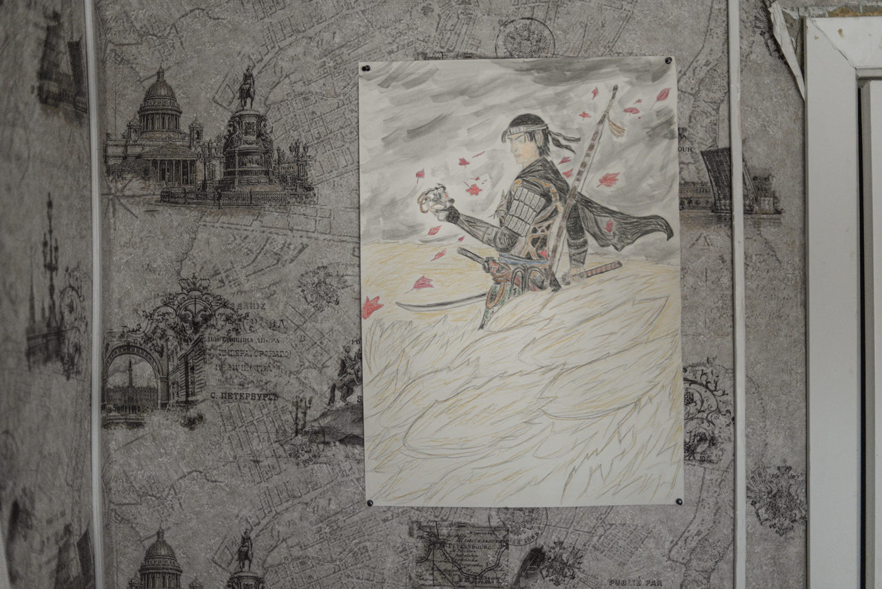 В оставленной комнате Сергея провода и инструменты соседствуют с его картинами: вот взлетающий самолет, который он нарисовал еще в техникуме, а вот японский воин в стиле аниме, написанный пару лет назад.