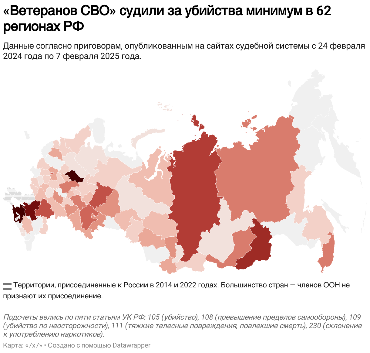 На карту попали только случаи, когда «7х7» нашел в текстах приговоров подтверждение, что подсудимый воевал на территории Украины (в словах самих подсудимых, их характеристике для суда или показаниях свидетелей). Иногда суды изымают эти данные из опубликованных документов или вообще не публикуют приговоры. Несколько решений были недоступны для прочтения на момент подсчетов. Суды по некоторым делам, о которых известно из сообщений медиа, еще не прошли, поэтому мы не учитывали эти случаи в подсчетах. Таким образом, количество убитых «ветеранами СВО» людей может быть выше.