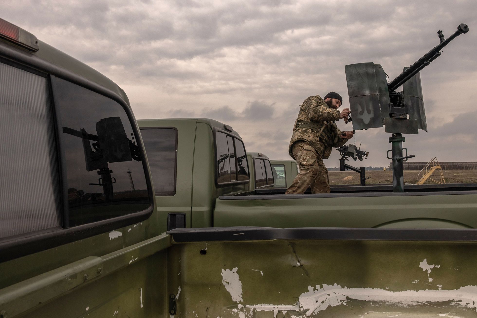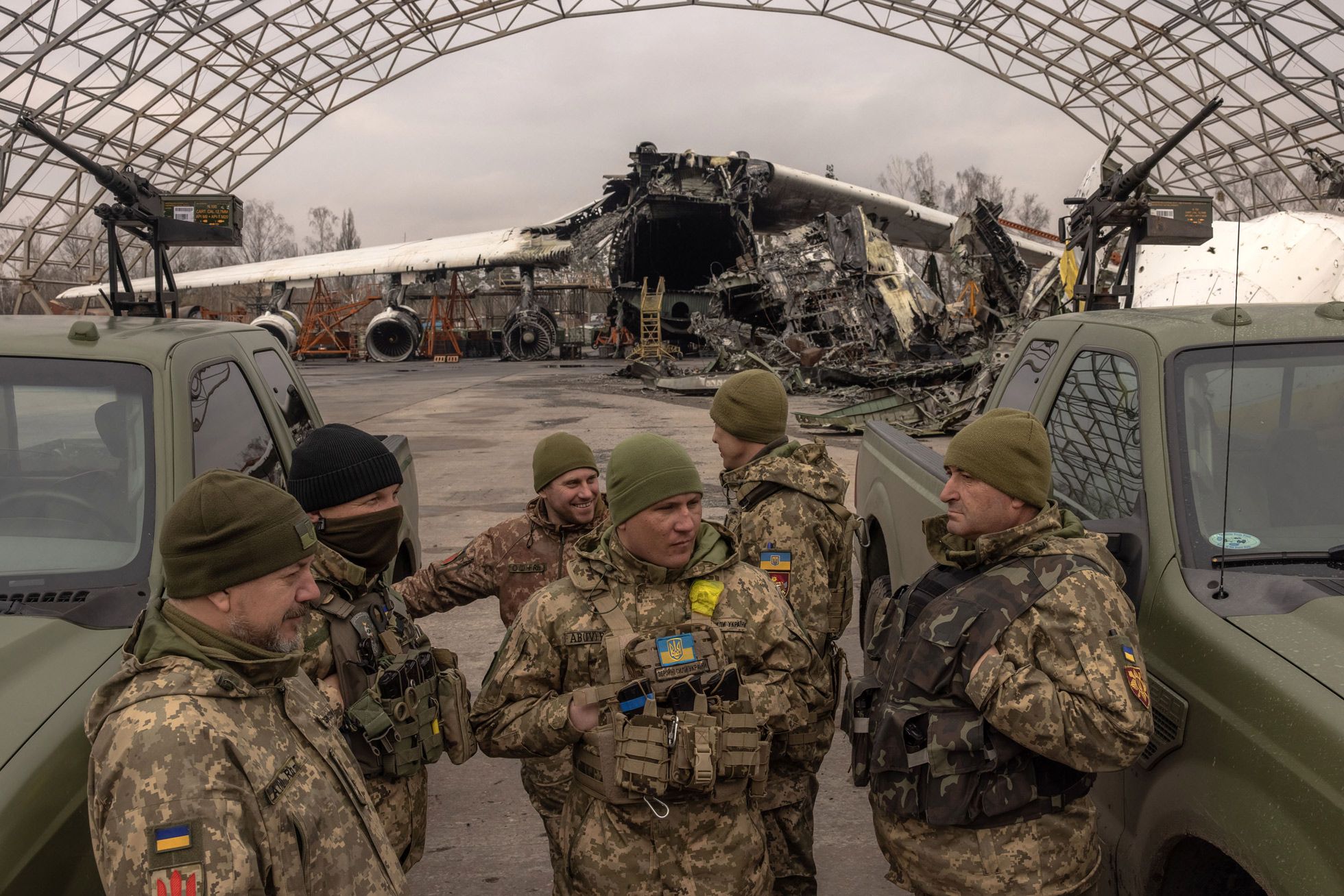 С первого дня полномасштабного вторжения аэропорт Антонов (до 2000-х годов носивший название «Гостомель» — по расположенному рядом пригороду Киева) стал важнейшей целью атаки российских войск. ВС РФ пытались занять аэропорт для обеспечения возможности переброски войск непосредственно в Киев, однако понесли огромные потери и так и не смогли добиться своей главной цели. Одной из жертв нападения на Гостомель стал уникальный Ан-225 «Мрия» — самый большой и грузоподъемный самолет за всю историю авиации. После отступления с севера Киевской области в конце марта 2022 года ВС РФ уже не пытались занять аэропорт, однако продолжили удаленные удары по нему ракетами или, все чаще в последнее время, дронами. Для защиты от воздушных атак Украине недавно было передано в том числе и легкое вооружение — пикапы с вмонтированными в задней части автомобиля зенитными пулеметами.