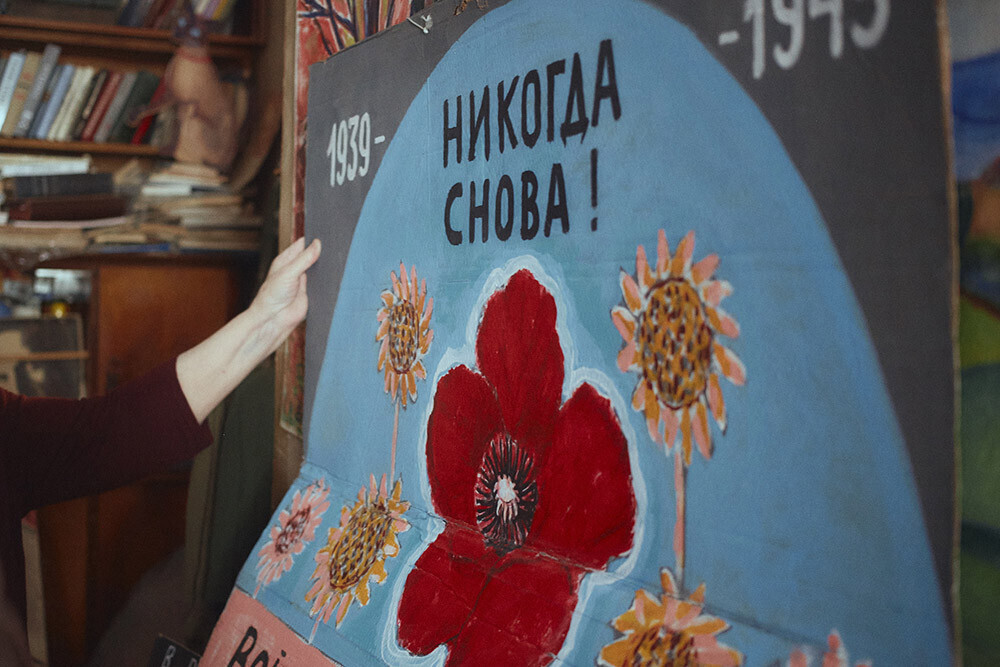 Эта женщина — Елена Осипова. Как художницу ее знают немногие. На экспозиции в митьковском музее она выставила работы, написанные маслом, на холстах и совсем в другой жизни. Сейчас Осипова известна скорее как автор политических плакатов, с которыми постоянно выходит в одиночные пикеты. С плакатом в руках она защищала Исаакиевский собор и фигурантов «болотного дела», выходила после захвата «Норд-Оста» и школы в Беслане, после уничтожения санкционных продуктов и гибели Бориса Немцова, после начала войны в Ираке и терактов в Париже. Горожане зовут ее «совестью Петербурга».
