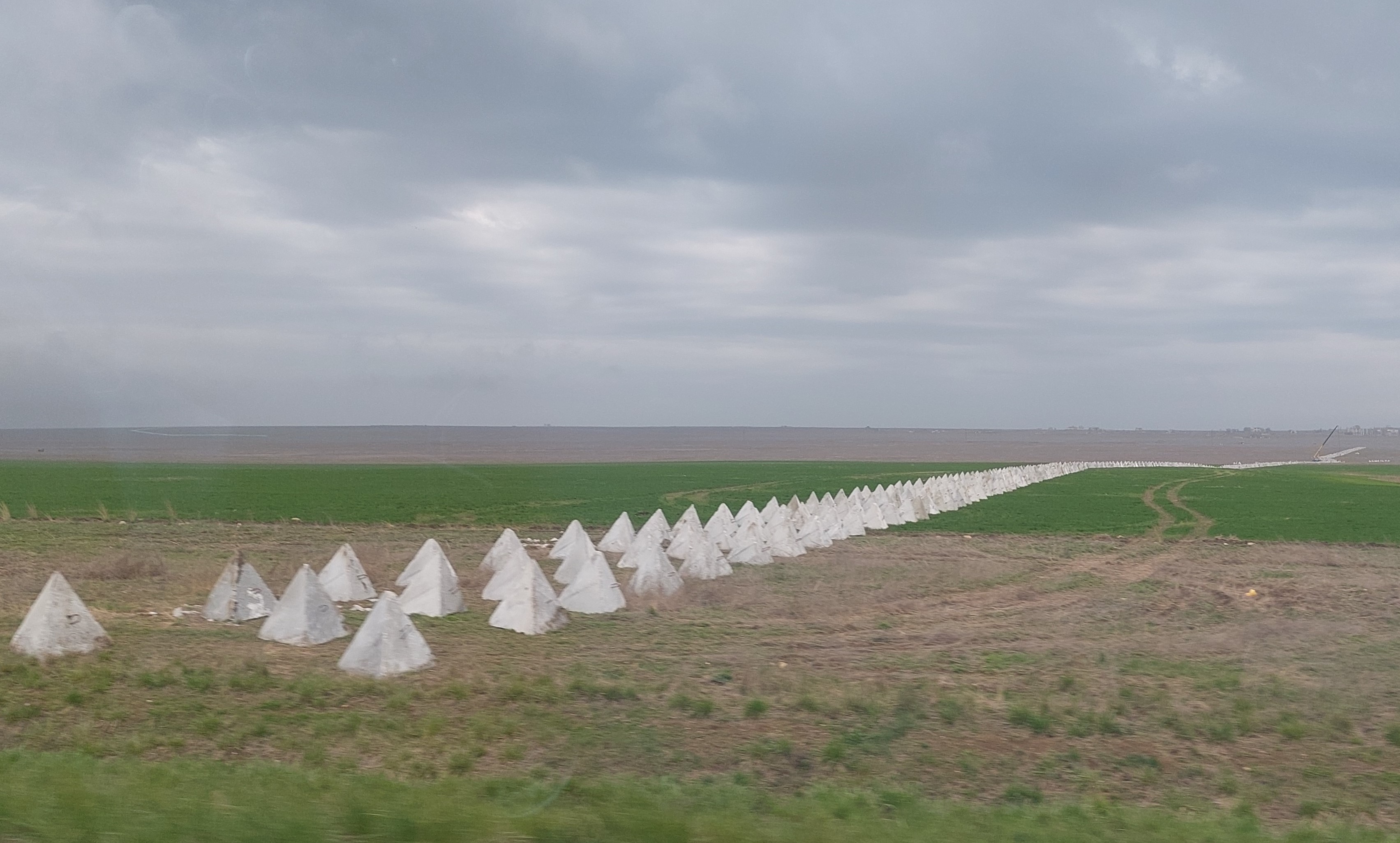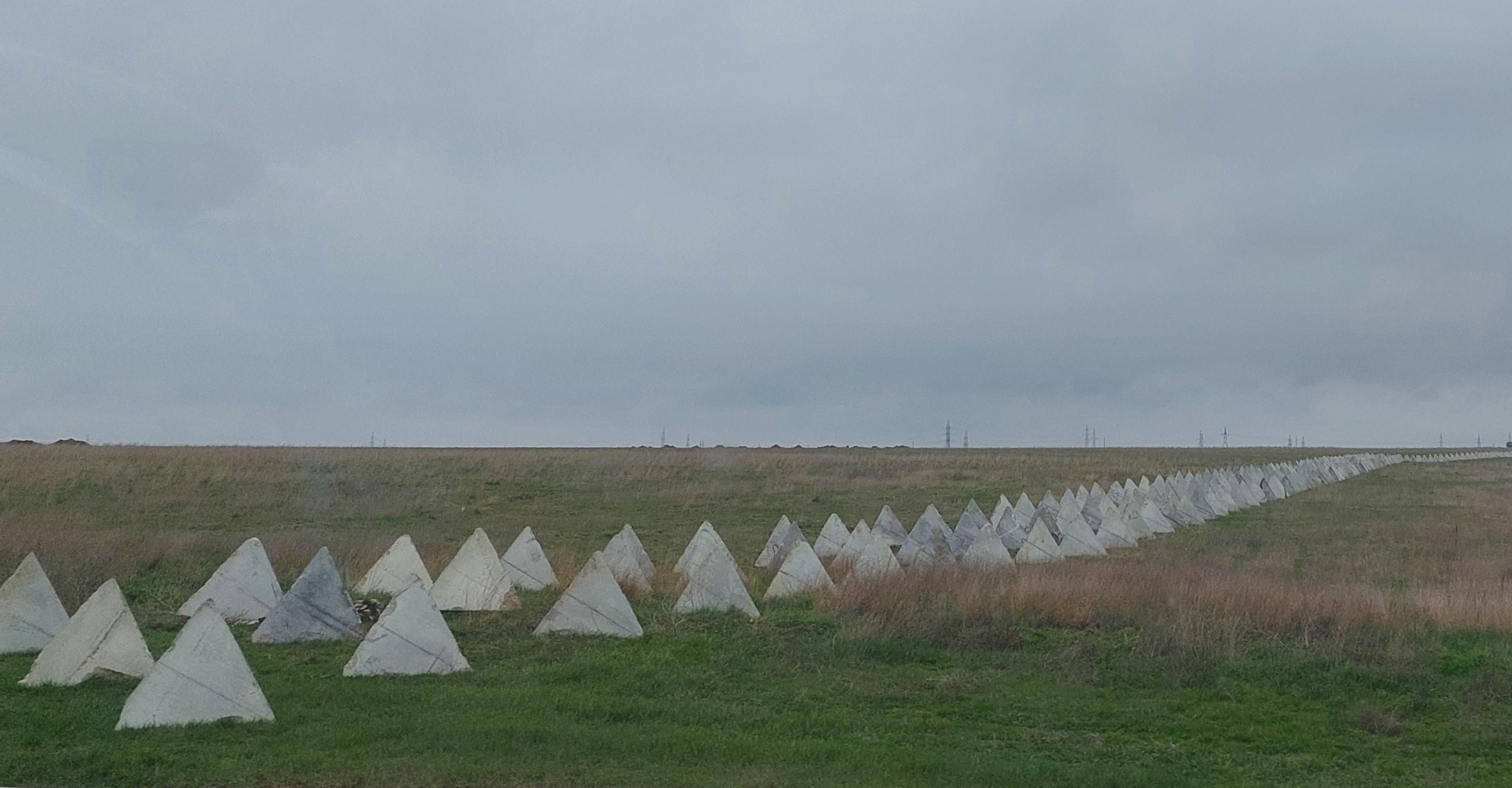 Как сообщает корреспондент Крым.Реалии, бетонные пирамиды укладывают в три ряда между поселком Приморский и селом Батальное. Рядом можно увидеть отвалы грунта, которые остаются после строительных работ.