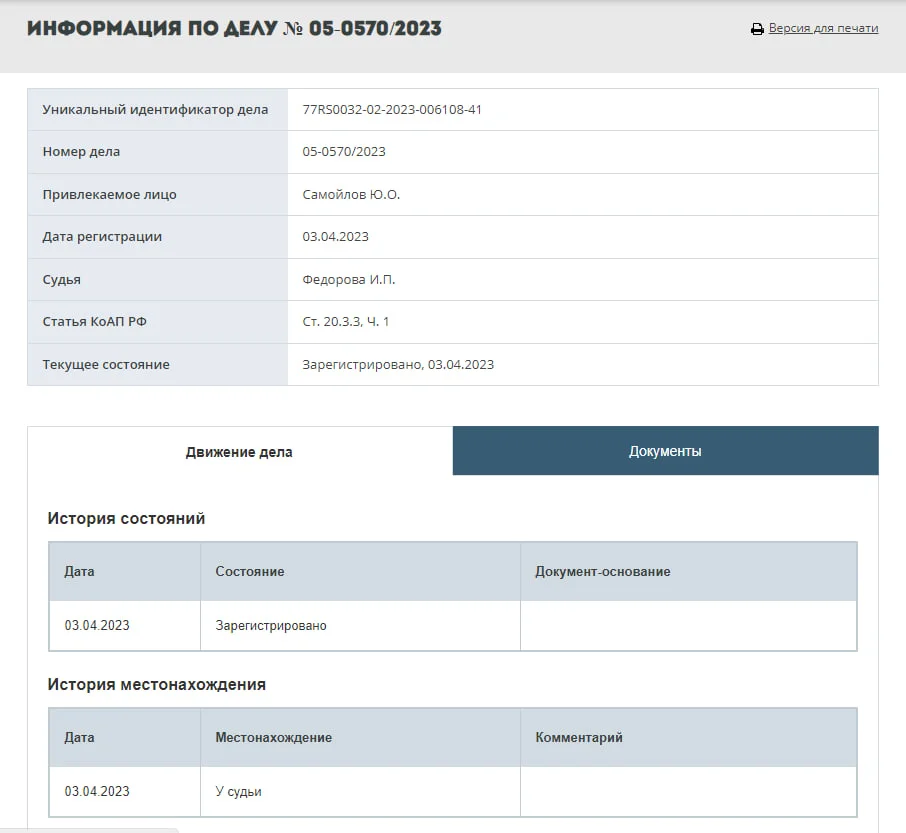 Согласно картотеке Черемушкинского районного суда Москвы, дело было зарегистрировано 3 апреля и в данный момент находится у судьи. Что стало поводом составления протокола, неизвестно.