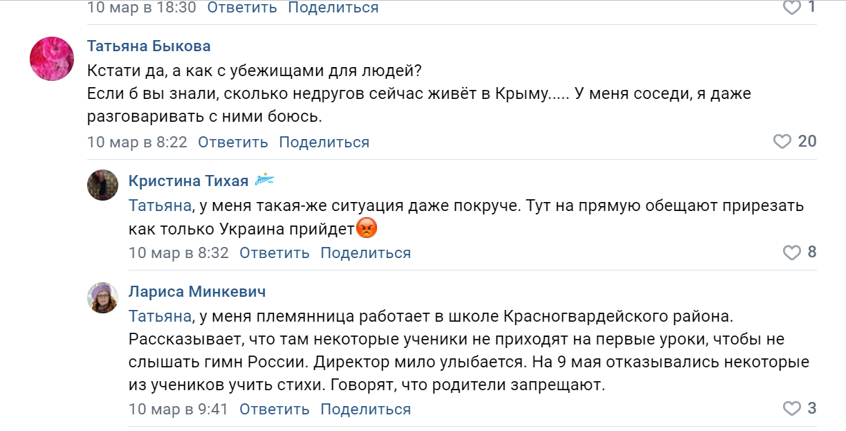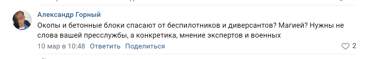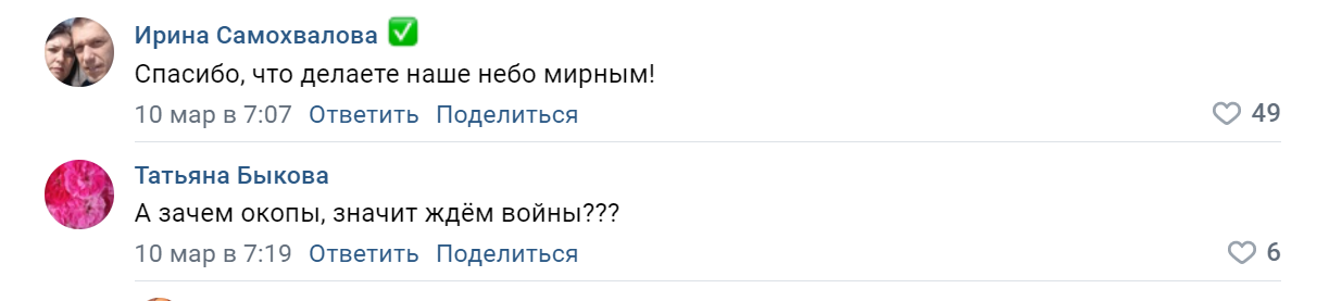 В соцсети «ВКонтакте» подписчики Сергея Аксенова по-разному реагируют на его публикации об оборонительных сооружениях в Крыму. Кто-то высказывает благодарность, другие не понимают, чем помогут окопы. Есть такие, кто просто делится переживаниями и страхами.