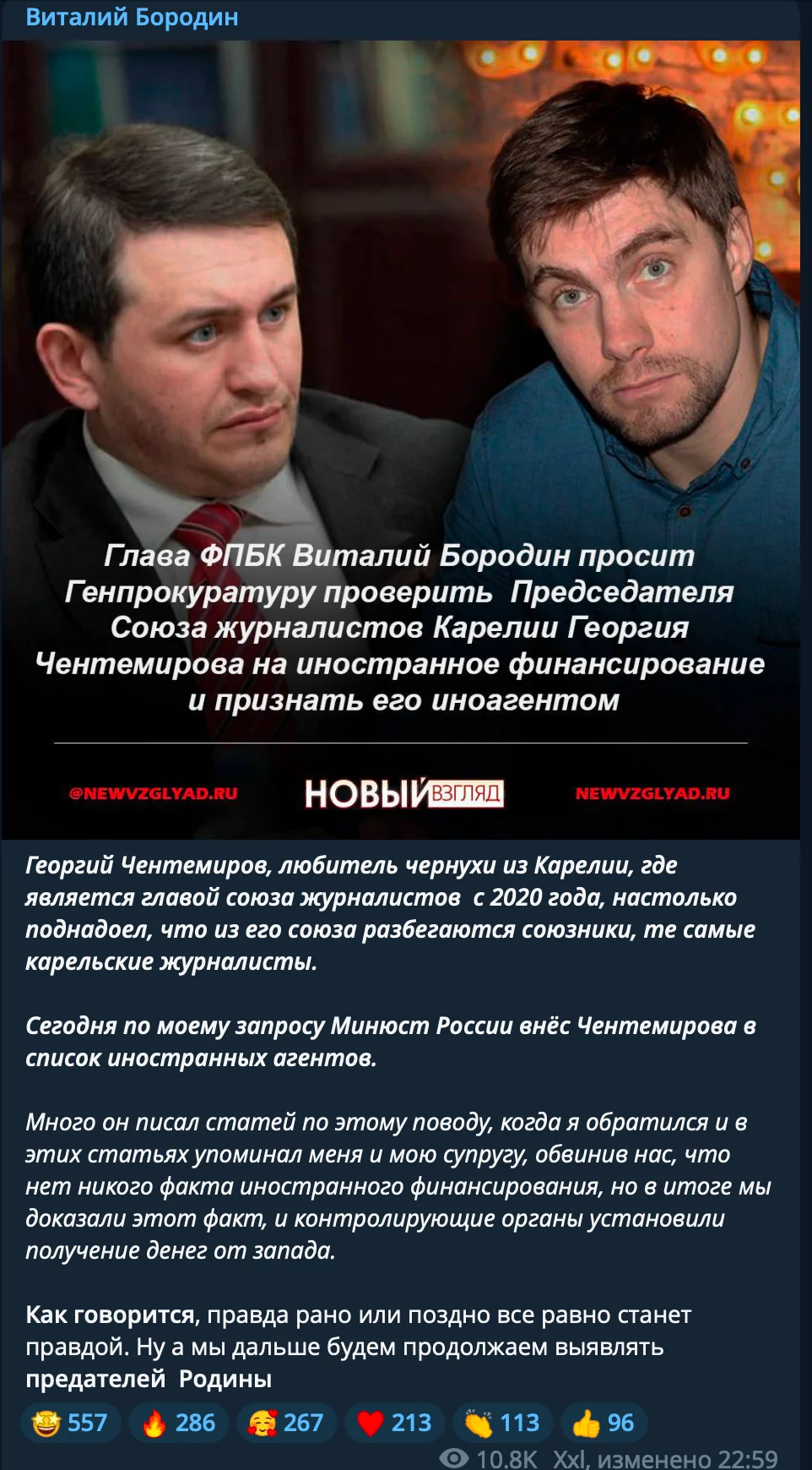 «Признание <его> иноагентом для нас новостью не стало. С самого начала специальной операции он наговорил на несколько сроков и уехал из России. В ближайшее время проведем конференцию регионального союза, где будет избран новый председатель», — так председатель Союза журналистов России Владимир Соловьев (надо пояснить, что речь не о телепропагандисте, а о его тезке) прокомментировал включение в список Минюста Георгия Чентемирова*, лидера карельского республиканского отделения Союзжура.