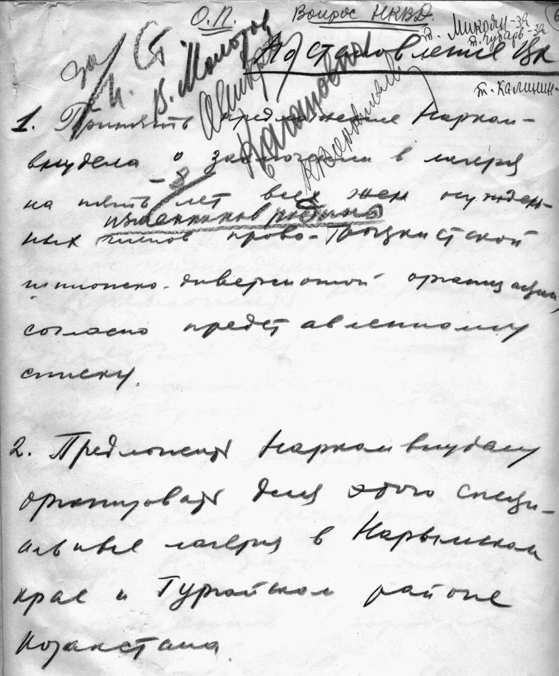 Но вглядимся в документ. Особенно в правки и дополнения, сделанные синим карандашом. Наркомвнудел (то есть Ежов) предлагал заключать жен «троцкистов» в лагеря на 5 лет — синий карандаш увеличил срок до восьми. Ежов предлагал «оставшихся после осужденных детей-сирот взять на государственное обеспечение» — синий карандаш уточнил: только «до 15-летнего возраста» — и добавил: «что же касается детей старше 15-летнего возраста, о них решать вопрос индивидуально». Это означало: если затаил злобу на родную советскую власть или просто несдержан на язык, отправлять вслед за матерью в лагеря или вслед за отцом в небытие.