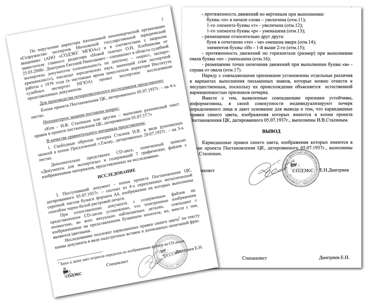 Мы решили это установить и отправили документ на экспертизу в Содружество экспертов Московской государственной юридической академии (СОДЭКС). Вывод опытных экспертов был однозначен: «Карандашные правки синего цвета, изображения которых имеются в копии проекта Постановления ЦК, датированного 05.07.1937 г., выполнены И. В. Сталиным».