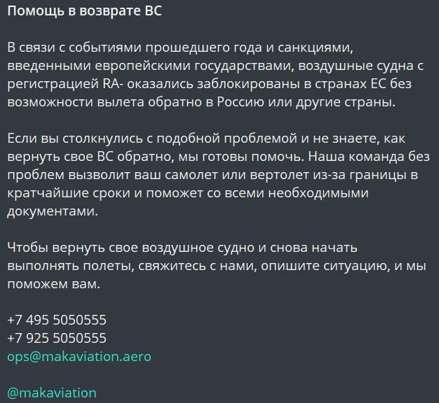 «Когда почти все границы закрыты, санкции мешают продавать самолеты, а нужно купить самолет или вертолет, у нас есть решение. Мы поможем вам с любыми международными сделками. При необходимости мы свяжемся с продавцом, согласуем цену и сроки, чтобы снизить ваш стресс», — говорится в одной из публикаций.