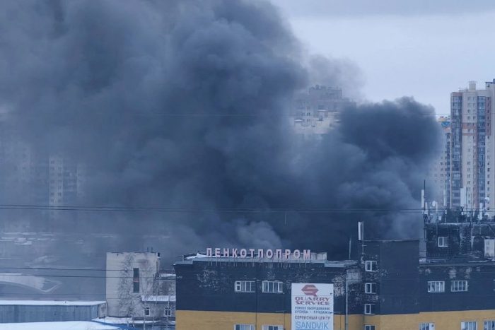 Как следует из видео, опубликованных в телеграм-канале «Мегеаполис», черный дым от пожара можно увидеть за несколько кварталов от скалада.