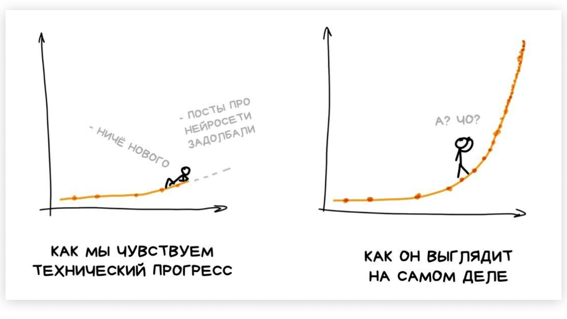Находясь в своей точке на таймлайне, мы опираемся исключительно на прошлый опыт, потому видим прогресс практически как прямую линию.