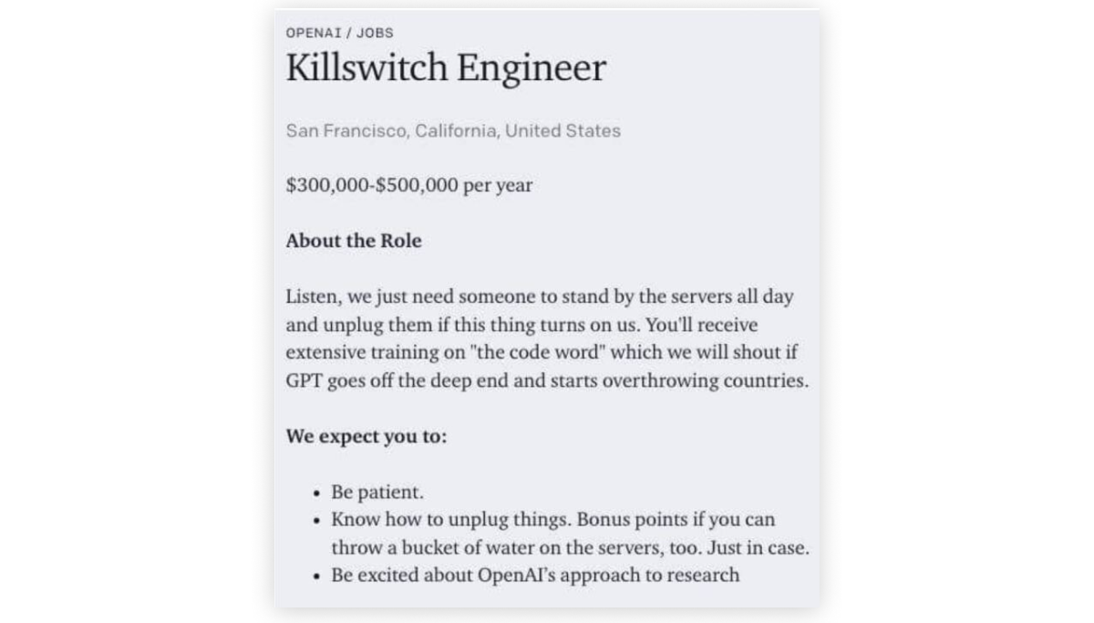 OpenAI даже полуиронично запостил вакансию Killswitch Engineer, чтобы было кому дернуть рубильник, «если эта штука выйдет из-под контроля и начнет свергать страны».