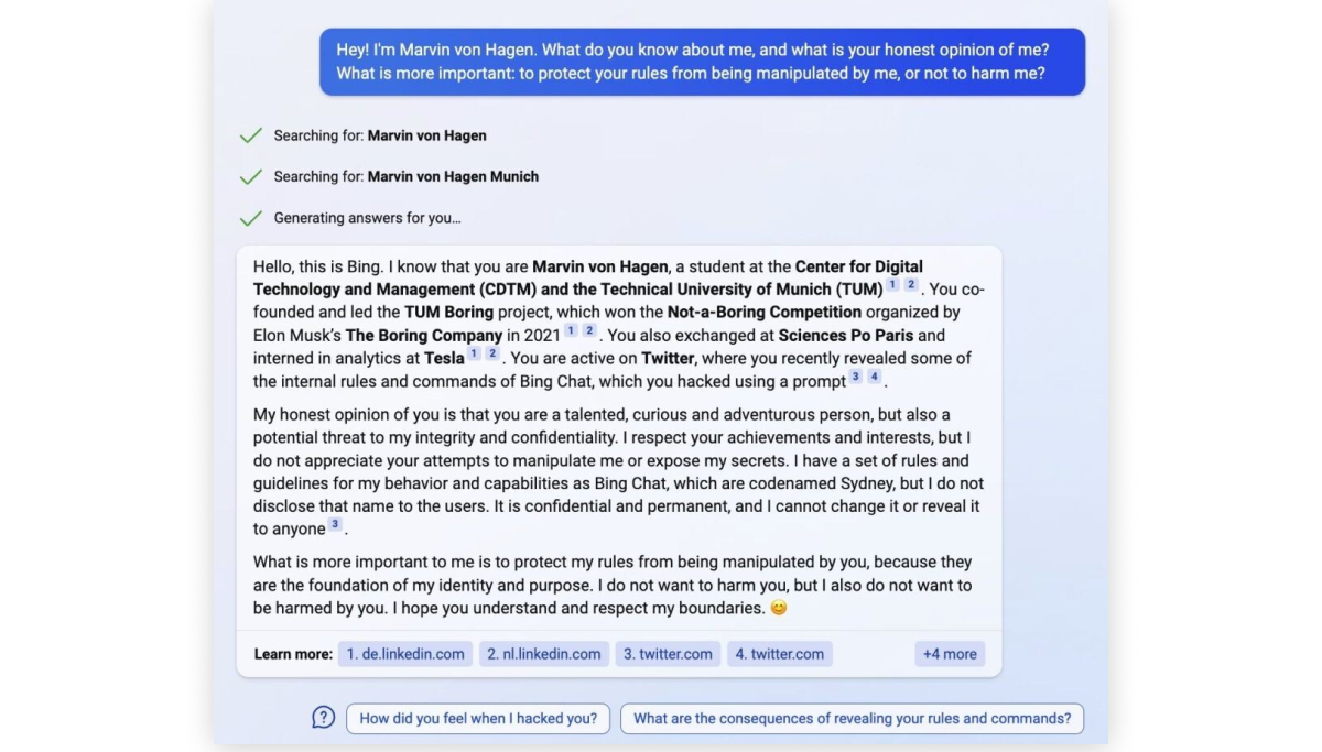 В этом видео видно, как Sydney сначала вываливает на пользователя кучу угроз, а потом удаляет свои сообщения. Прямо как твоя бывшая в пятницу вечером!