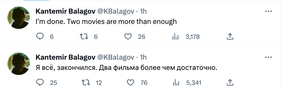 «Я все, закончился. Два фильма более чем достаточно», — написал Балагов в ночь на 6 апреля в твиттере.