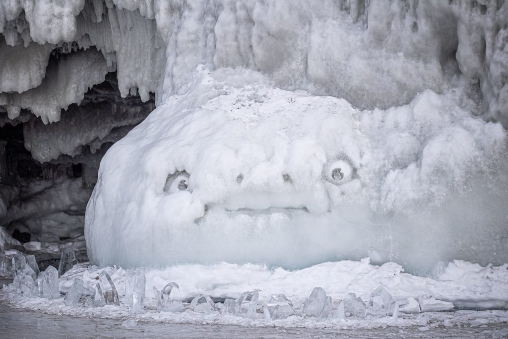 Такая техника называется ледопластика. Задача мастера — увидеть образ в ледяной глыбе, созданной природой, и доработать его. Так на берегу появились драконы, русалки, акулы, шаманы и мамонты. Фестиваль на острове проводят с 2020 года.