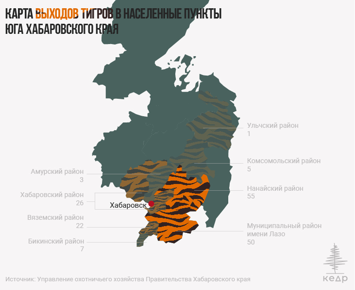 "В России уже обитает 750 особей амурского тигра, включая тигрят. Молодые тигры в поиске свободных участков широко расселяются по территории Хабаровского и Приморского краев. Это неминуемо приводит к увеличению вероятности встреч тигра с человеком и усилению угрозы конфликтов с населением.