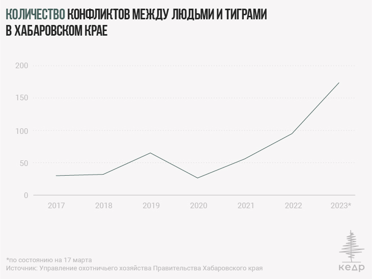 Согласно официальным данным охотнадзора Хабаровского края, ситуация за последние пять лет серьезно обострилась. Если в 2017 году между людьми и тиграми было зафиксировано 30 конфликтных ситуаций, то в 2022 году – 95, а за одни только январь и февраль 2023 года – уже 106 случаев.