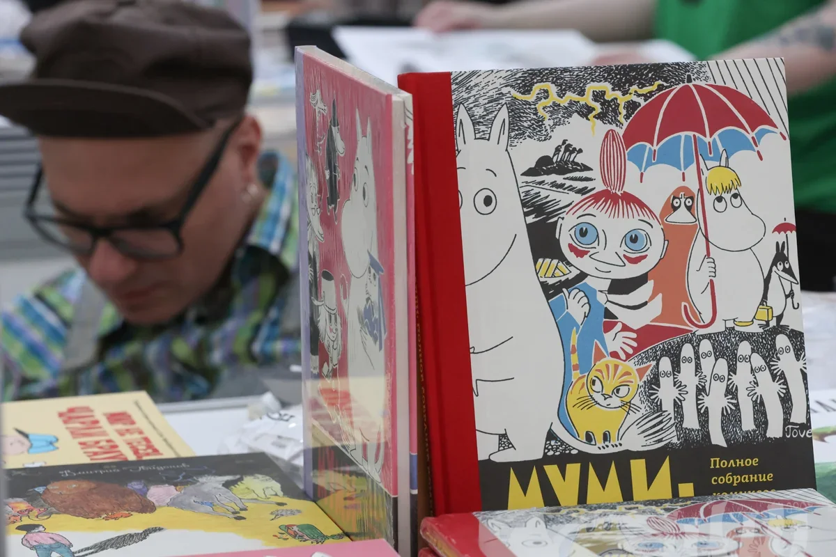Ассортимент книг на стендах представляет из себя зрелище довольно сюрреалистическое: с одной стороны прохода, на стенде «Питера», обложенный антологиями «Воскресшие на Третьей мировой» и сборниками есенинских стихов «Спаса кроткого печаль…» с предисловием Прилепина, лежит Лимонов. Через дорогу, в начале сектора детской литературы, возвышается стопка «Муми-троллей» во всех возможных форматах и размерах. Стопку венчает флажок с надписью «А их точно запретили?».
