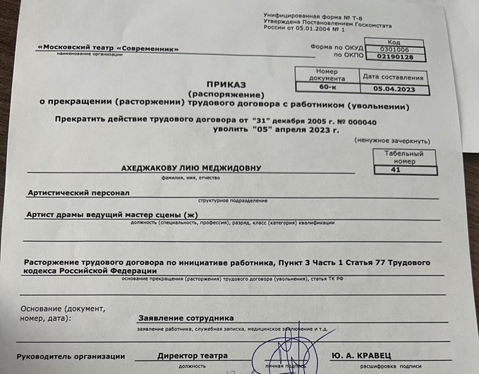 Лию Ахеджакову уволили из театра «Современник» 5 апреля. Приказ опубликовал Леонид Невзлин*. Она написала заявление, после того как руководство театра сняло с репертуара последний спектакль, в котором сыграла актриса.