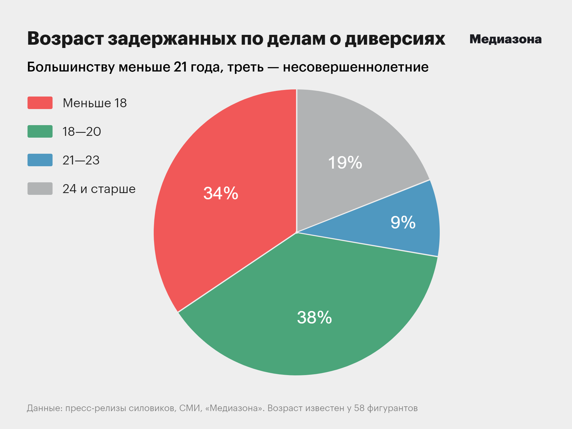 До войны в России очень редко судили по статье о диверсиях, от силы пара приговоров в год (всего восемь осужденных с 2011 по 2021 год). Новая волна обвиняемых пока еще не попала в суды: регулярные задержания начались только осенью, а значительная их часть пришлась на январь и февраль.
