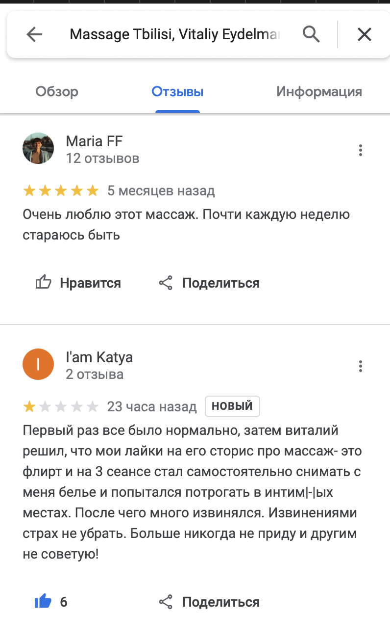 Спустя пять месяцев эта же пользовательница поставила пять звезд новому адресу работы Эйдельмана: Тбилиси, улица Василия Петриашвили, 21. Больше положительных отзывов в гугл-картах у массажиста нет. Есть один отрицательный отзыв с комментарием, в котором девушка сообщает о домогательствах во время сеанса и пишет, что Эйдельман снимал с нее белье и трогал в интимных местах. Еще несколько отзывов без текста — с единицами.