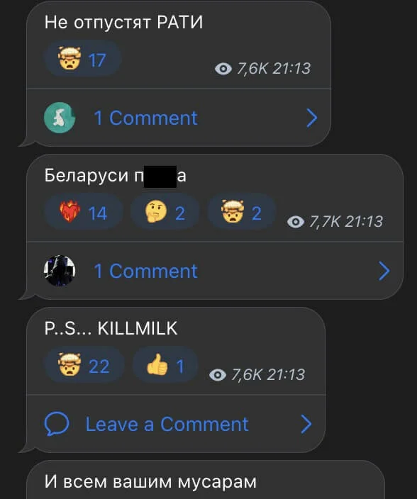 После ареста Елисеева в канале Killmilk появились угрозы в адрес белорусских спецслужб. «Не отпустят РАТИ. Беларуси пизда. P. S. KILLMILK. Республика Беларусь в черном списке», — написал глава проекта. Затем сообщения были удалены.