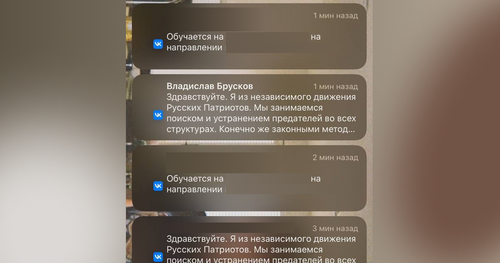 Когда девушка прекратила общение с членом «движения», ей начали писать другие люди, представляющиеся участниками «Русских Патриотов». Они также нашли другие ее соцсети, где присылали одинаковые по форме сообщения, в которых члены «движения» угрожали написать на нее несколько заявлений и передать «специальным органам».