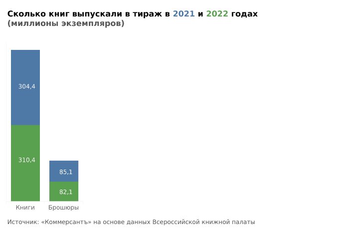 Что известно о тиражах книг. Авторы «Коммерсанта» также привели статистику Всероссийской книжной палаты. Так, в 2022 году тираж книг увеличился почти на 1,97 % по сравнению с 2021-м, в то время как выпуск брошюр увеличился на 3,65 %, посчитала «Бумага».