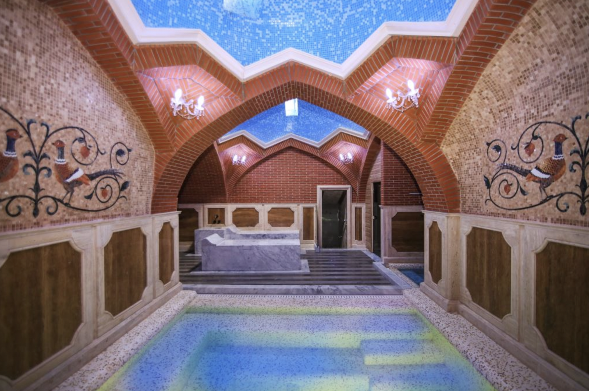 Считается главной баней в комплексе Абанотубани. Баня выстроена в узнаваемом персидском стиле — снаружи здание облицовано голубой плиткой. Внутри есть 12 отдельных номеров разного размера. В каждом есть горячий серный бассейн, душевая и туалет, в некоторых — холодный бассейн, финская сауна, телевизор, массажный кабинет и даже снежная комната.