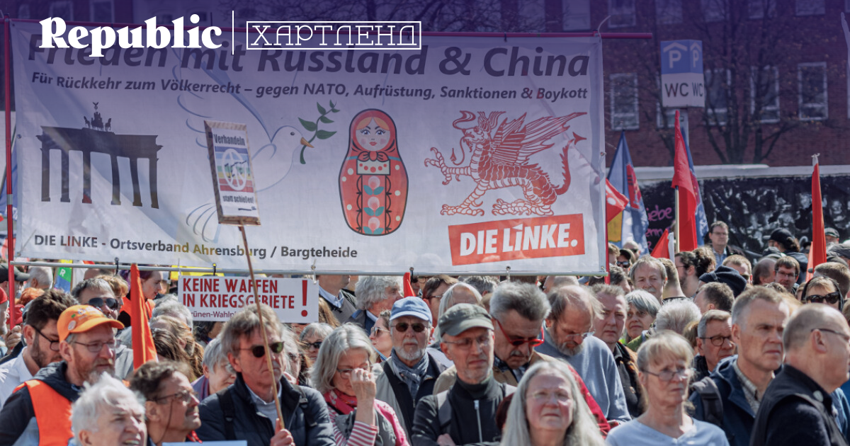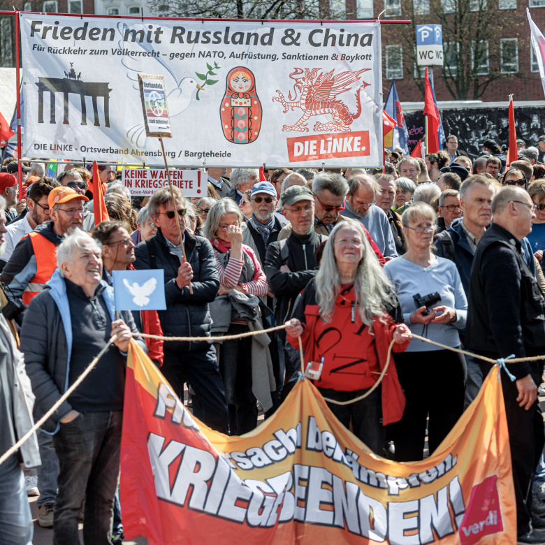 Пропутинский митинг в Гамбурге 10 апреля, прошел под лозунгами: за мир с Россией и Китаем, возврат к международному праву, против НАТО, антироссийских санкций и бойкота РФ