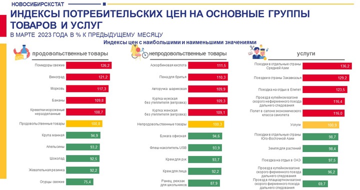 15:37 Цены на продукты в Новосибирской области в январе-марте 2023 года выросли в среднем на 2,62%, следует из документов Новосибирскстата.