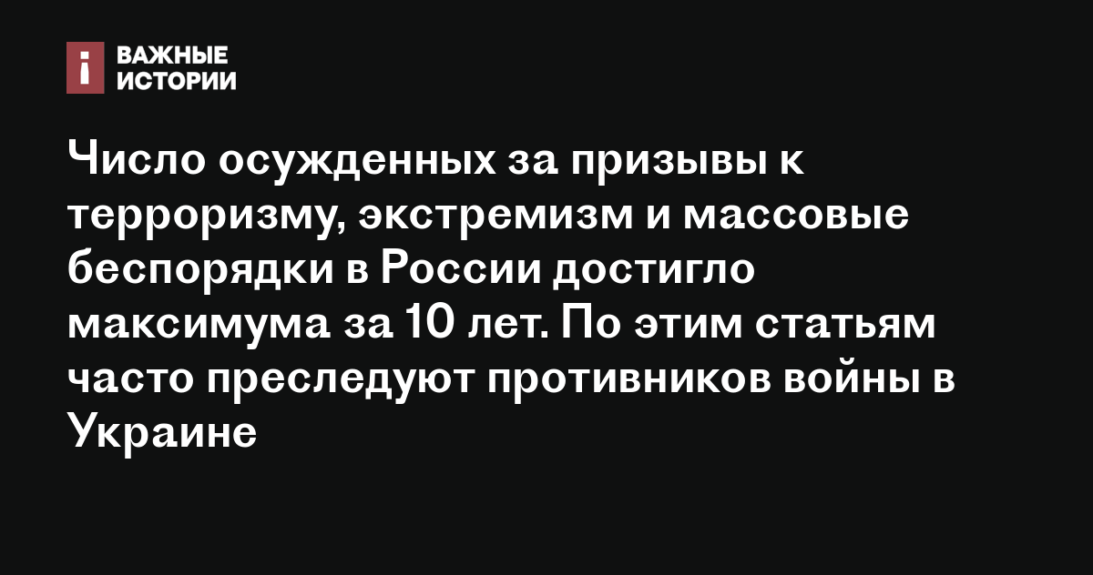 Число осужденных за призывы к терроризму, экстремизм и массовые беспорядки в России достигло максимума за 10 лет. По этим статьям часто преследуют противников войны в Украине