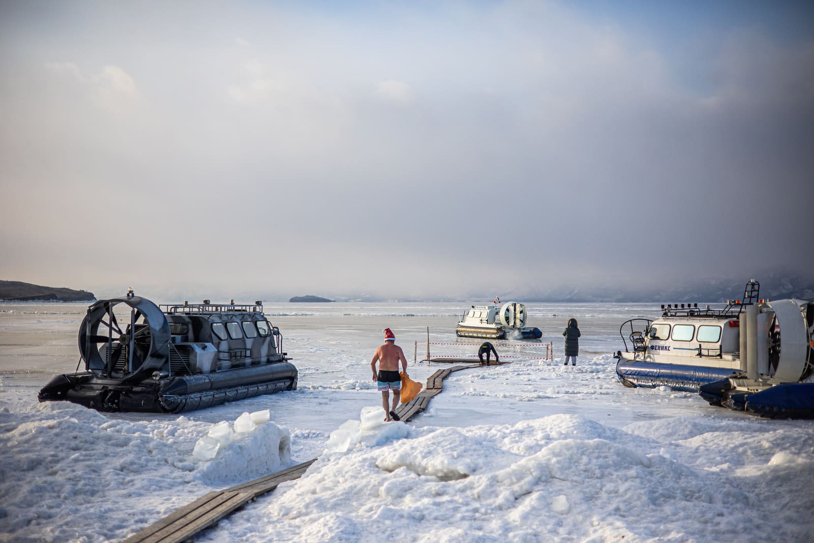 В январе и феврале пролив покрыт льдом, но он ещё не прочный. Поэтому машинам нельзя на него выезжать. В это время людей с материка на Ольхон по льду перевозят на хивусах. Это судно на воздушной подушке. Место стоит 500 рублей.