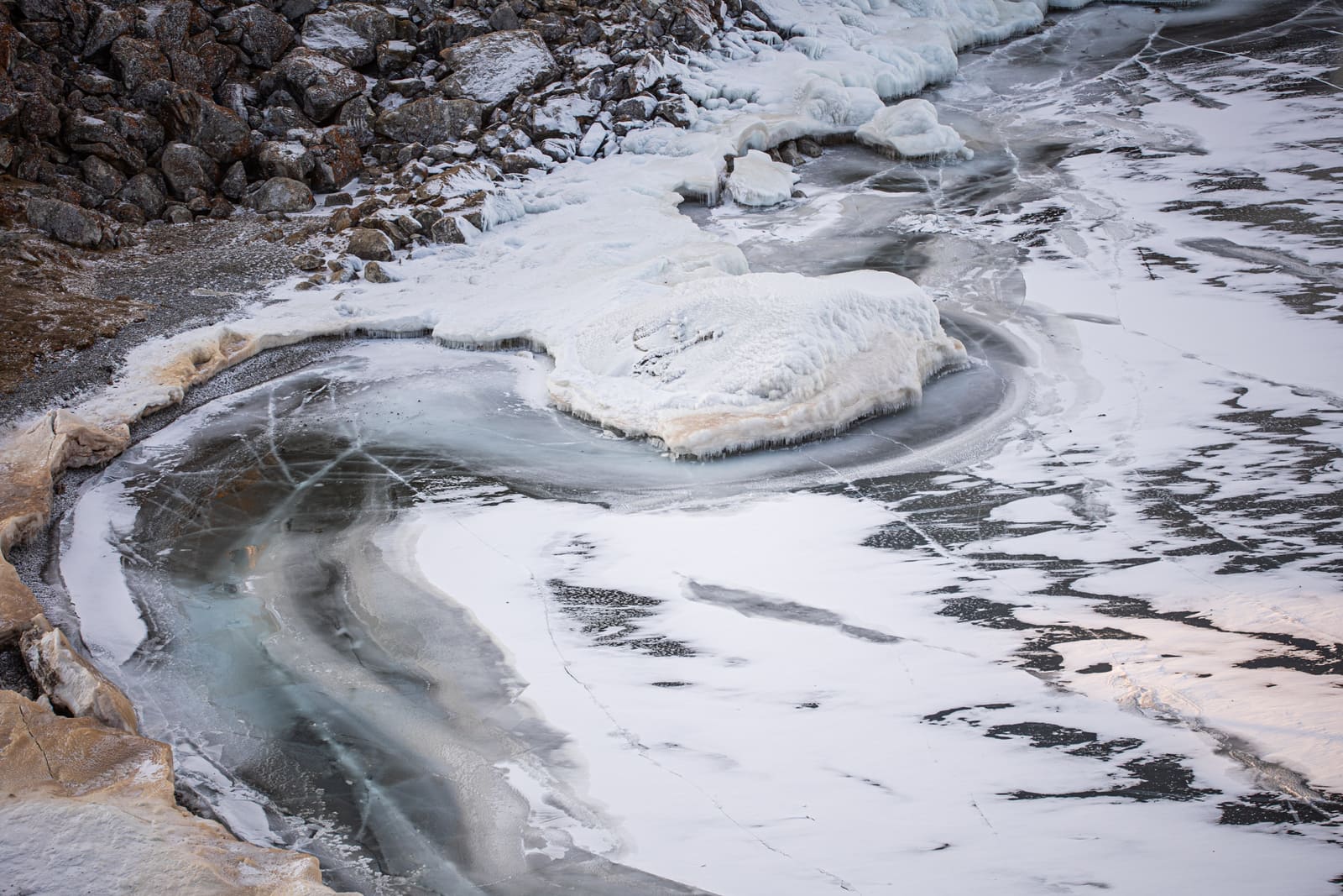 На прибрежных скалах после штормов появляются "сокуи" — ледяные наросты. На берегу вырастают ледяные холмы — "сопки", высотой до шести метров. Поверхность озера тоже застывает неравномерно. На некоторых участках ровного ледяного зеркала образуется "колобовник" — небольшие круглые глыбы. Ездить по такому льду очень трудно. Когда вода совсем промерзает, образуется донный лёд. Он покрывает камни под водой, причалы, рыболовные сети.