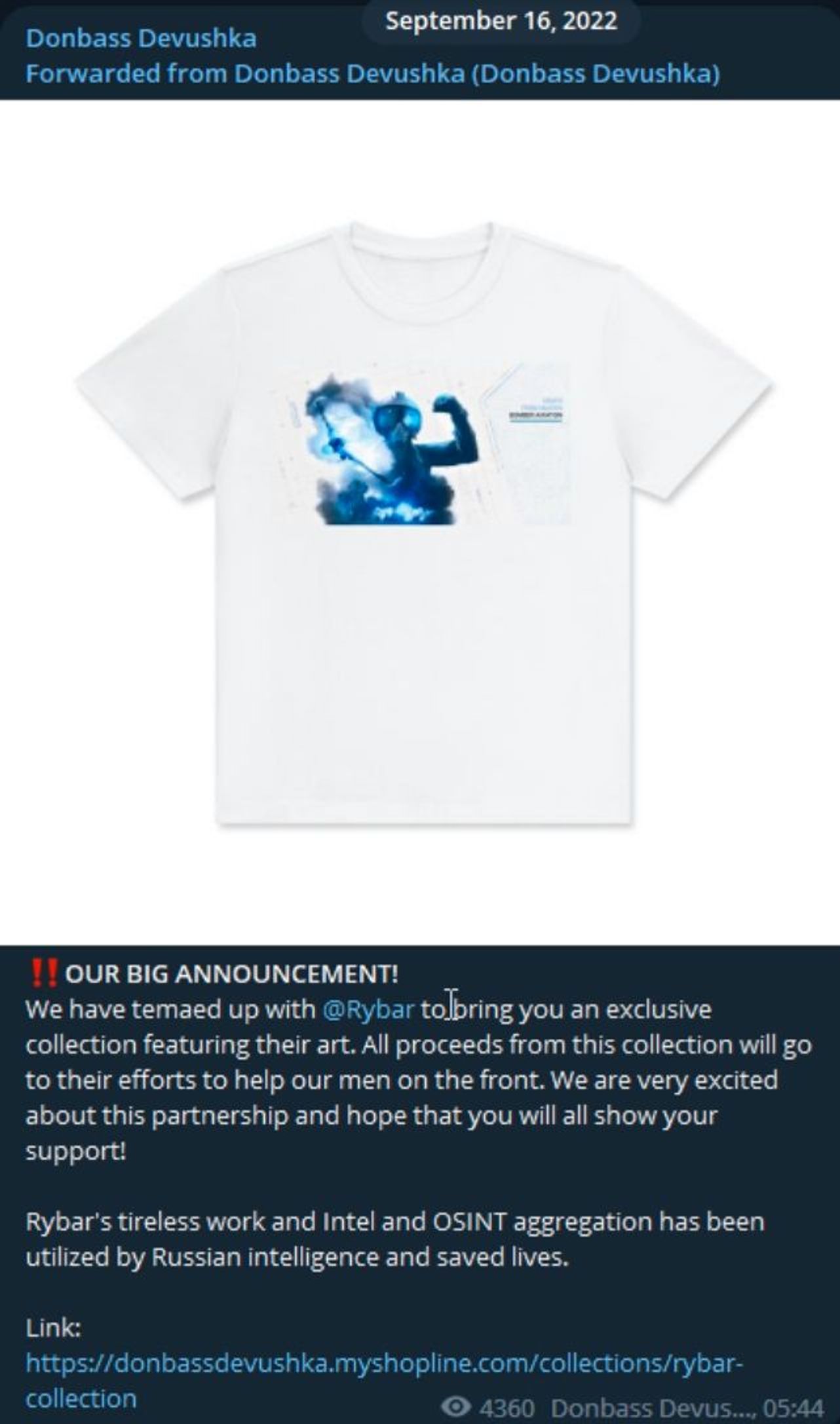 Her Telegram channel publishes large amounts of content banned on Twitter, including memes, fake images, and ultra-violence. Examples of these posts include celebrations of the murder of a retired US Marine who went to Ukraine as a foreign volunteer, videos of dead Ukrainians, and support for a video of a Ukrainian prisoner of war beheaded by Russian mercenaries from the Wagner PMC.